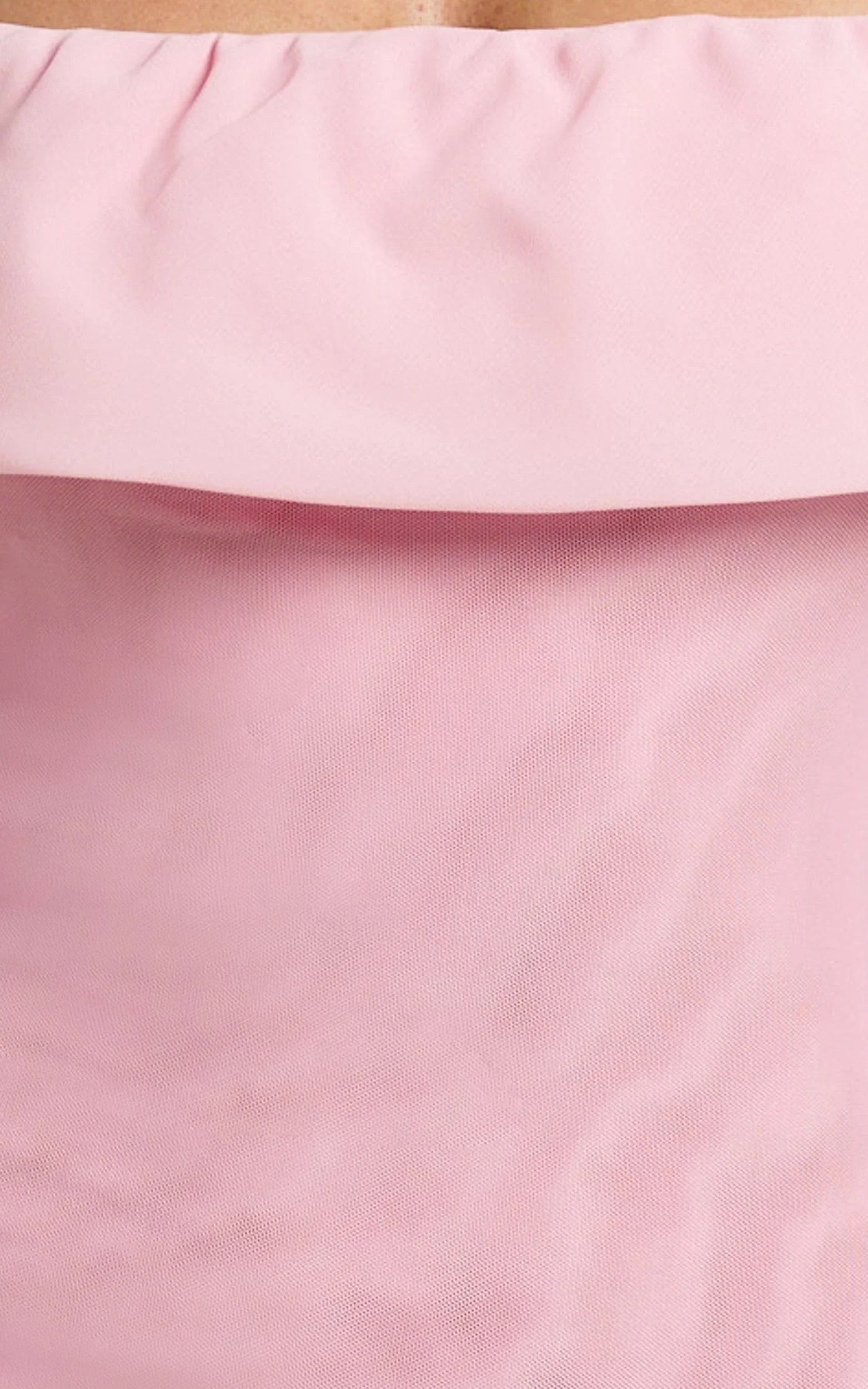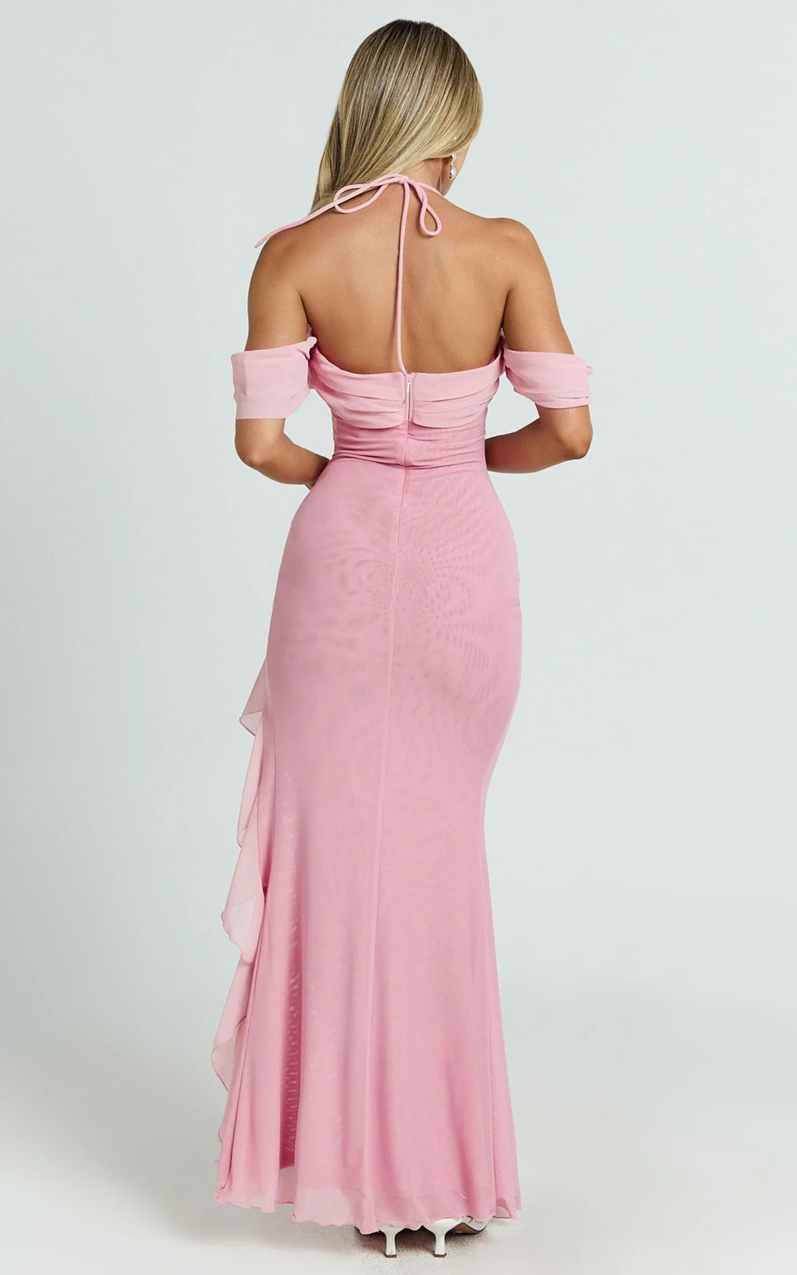 The sculpting neckline frames your shoulders, while the cascading trim adds just-right drama for weddings, formals, and nights that end with compliments. Think statement yet effortless: a pink showstopper that flatters, flows, and photographs beautifully.