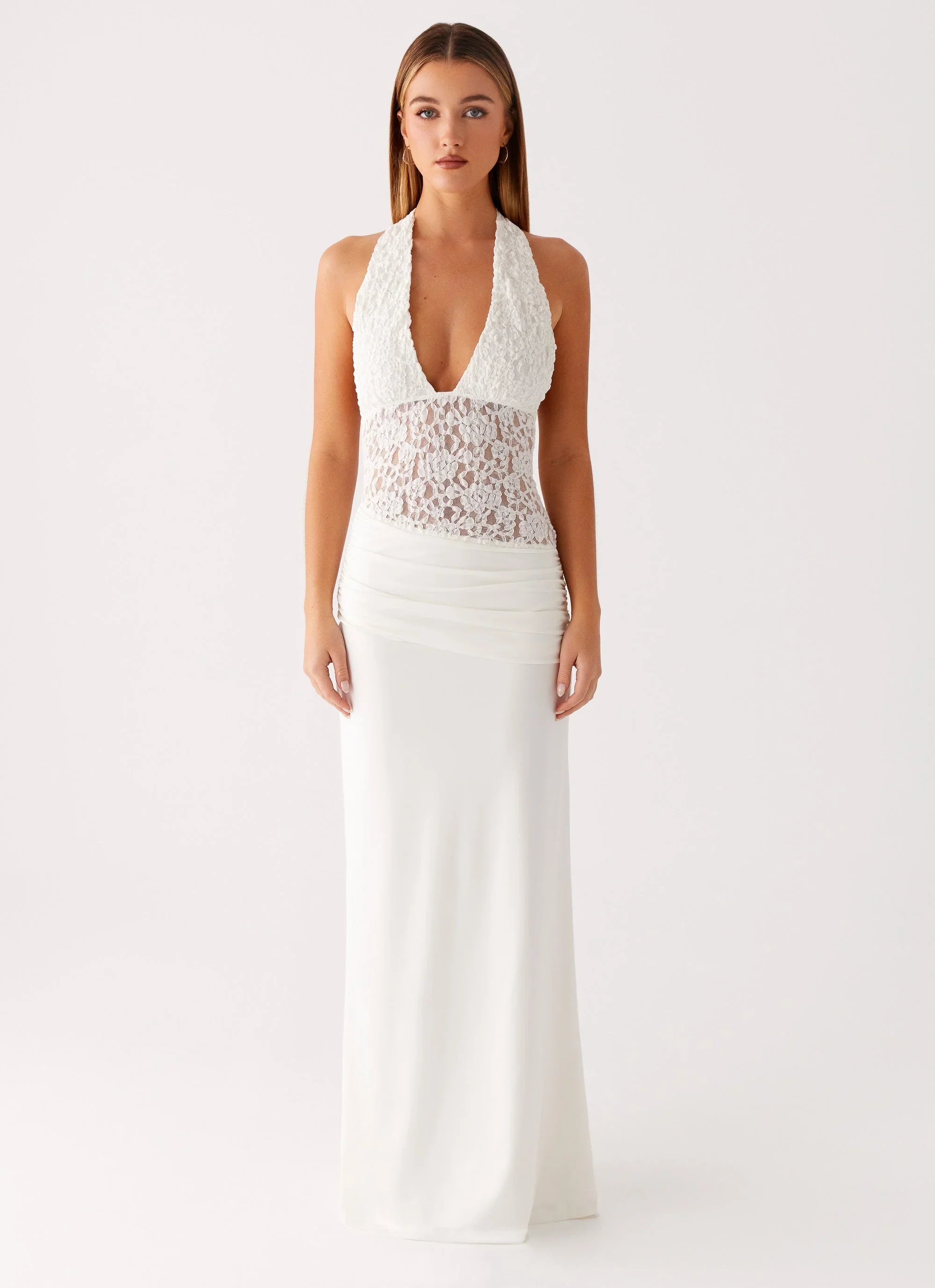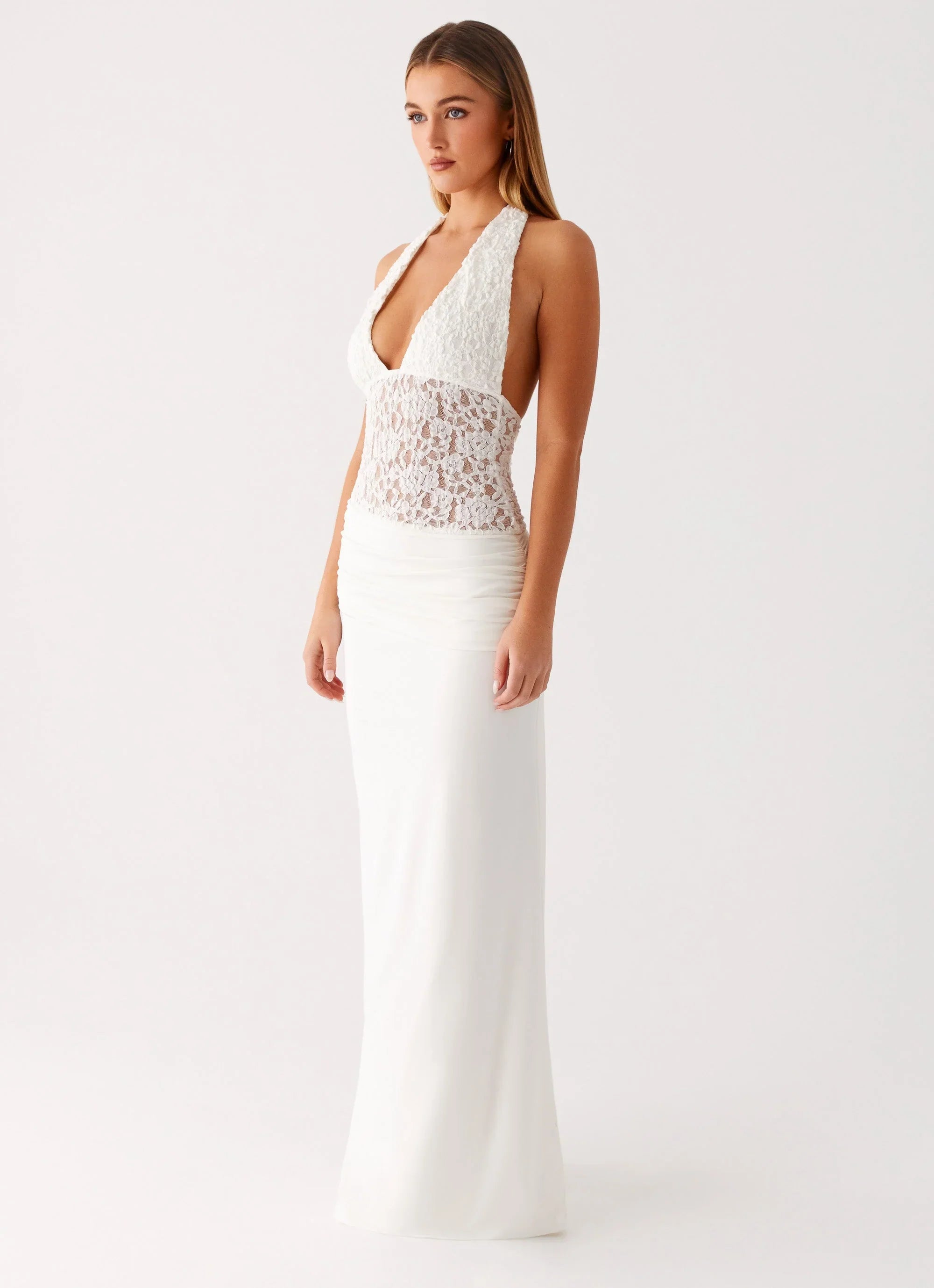 The Miri Halter Maxi Dress features a deep V neckline and a flattering halter silhouette. Crafted from stretch lace and jersey, it’s designed with a semi-sheer bodice, lined bustier and skirt, and a low back. The thick neck tie strap completes the look with bold elegance.