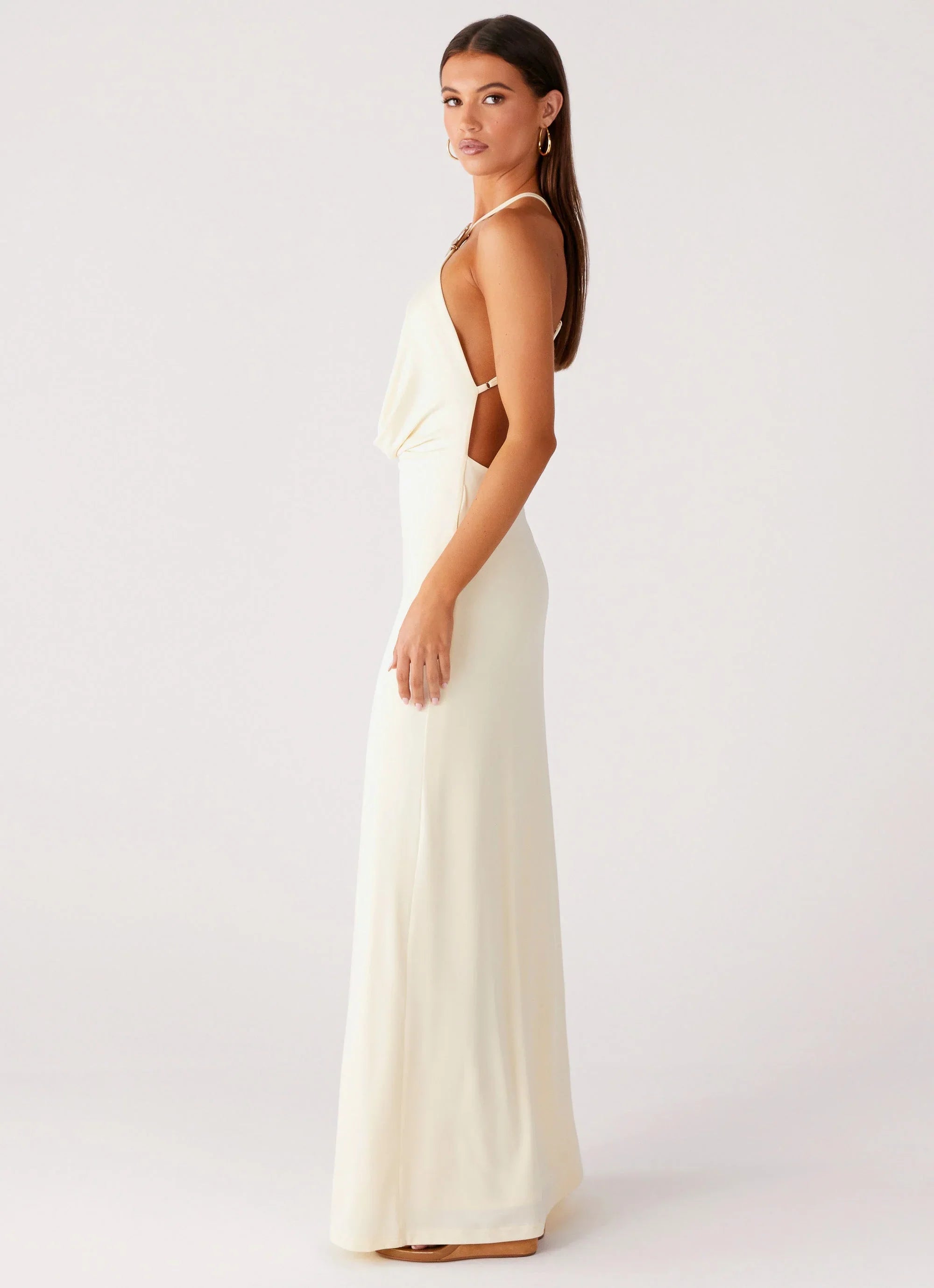 The Mistlight Cowl Maxi Dress is made for glowing nights with effortless elegance. Featuring a cowl neckline and open back, this fully lined jersey dress is detailed with adjustable straps and hardware accents for a sleek finish.
