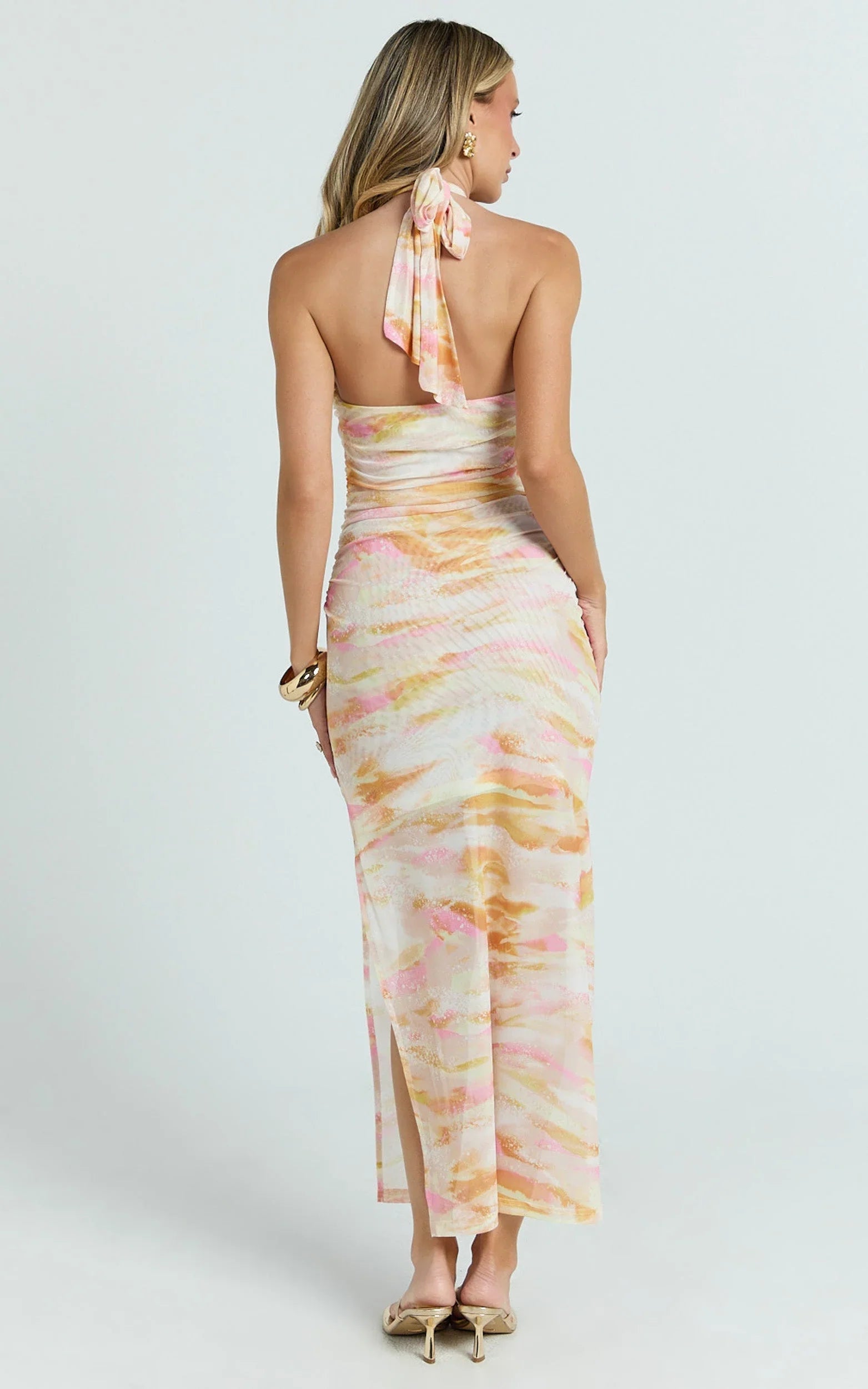 Slip into the Nessa Midi Dress and let the fitted mesh and halter detail contour and flatter from every angle. Style it with strappy heels and a mini shoulder bag for a polished finish, or add delicate hoops to keep the focus on that print. A standout pick for summer occasions, this midi dress pairs bold colour with a refined silhouette, your new go-to when you want all eyes on you.