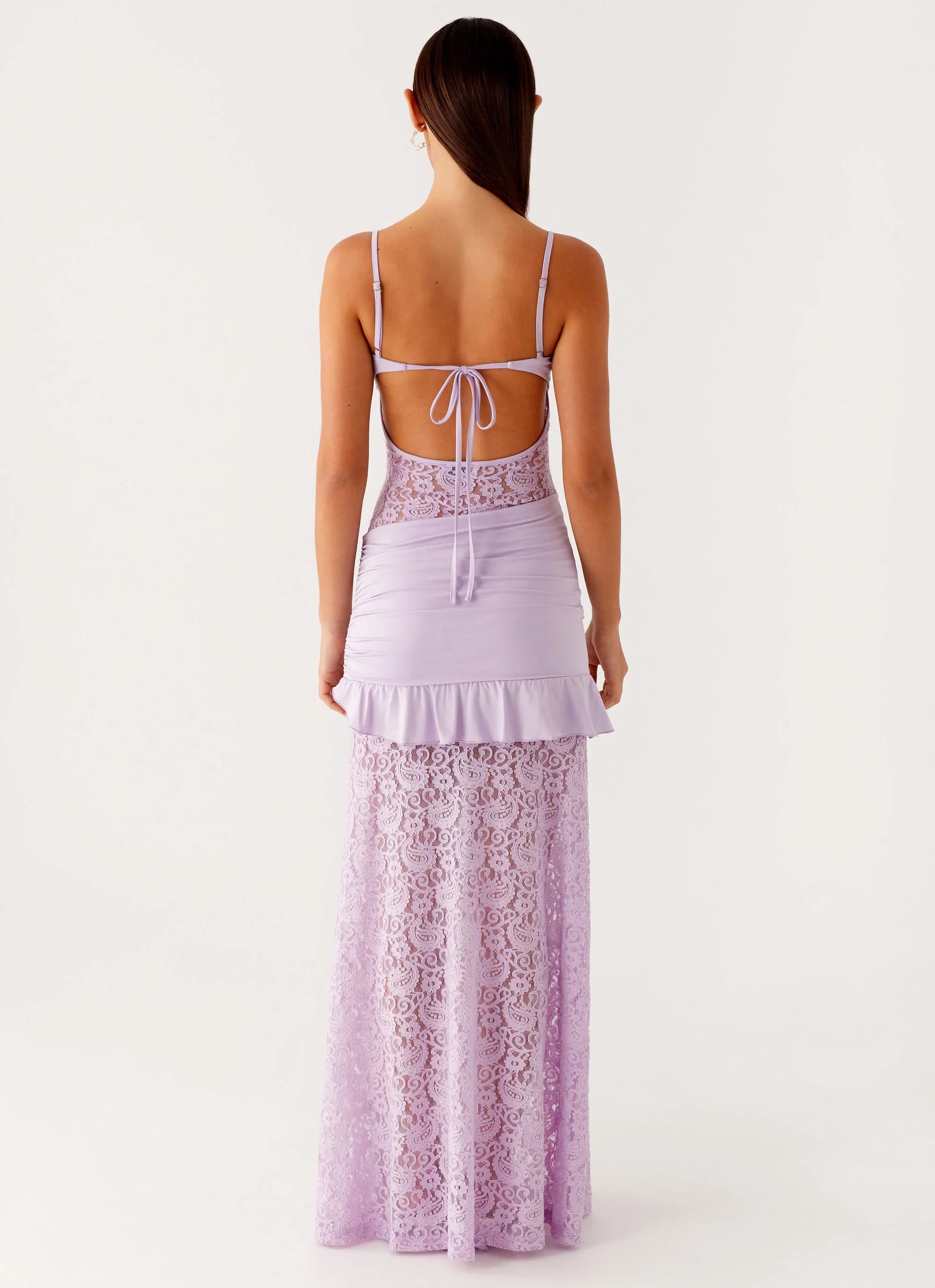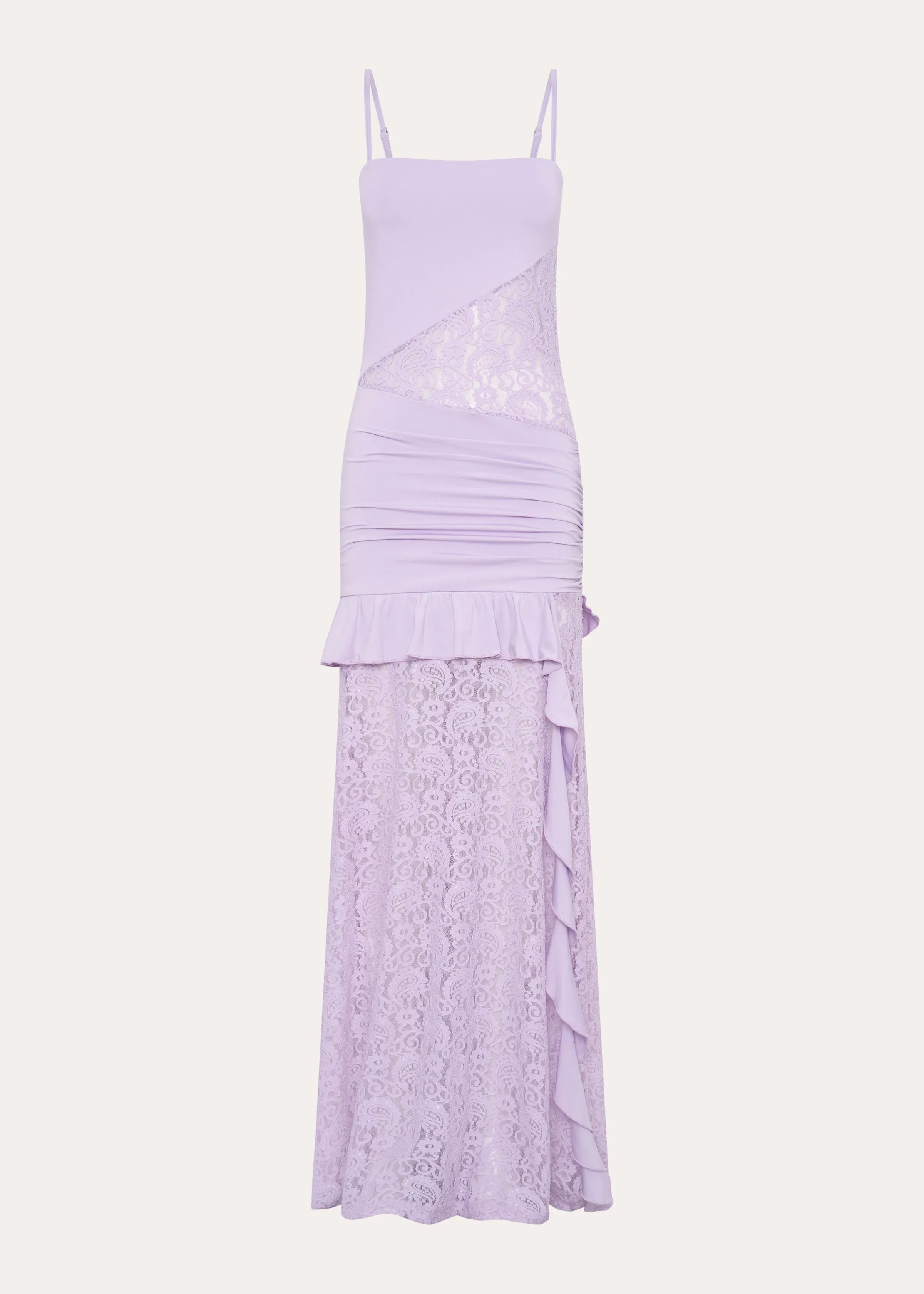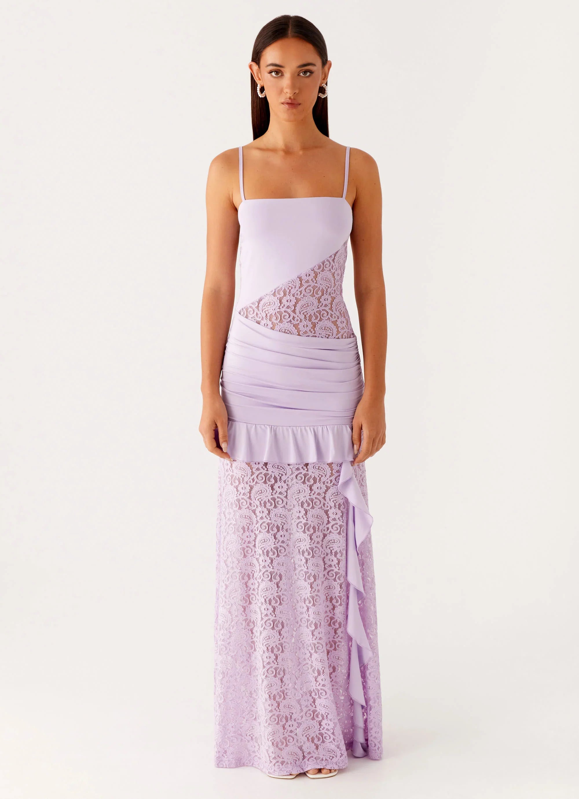 The New Romance Maxi Dress is a blend of classic elegance and delicate detail. With its straight neckline, it offers a clean, sophisticated look, while the lace panelling adds a romantic, intricate touch.