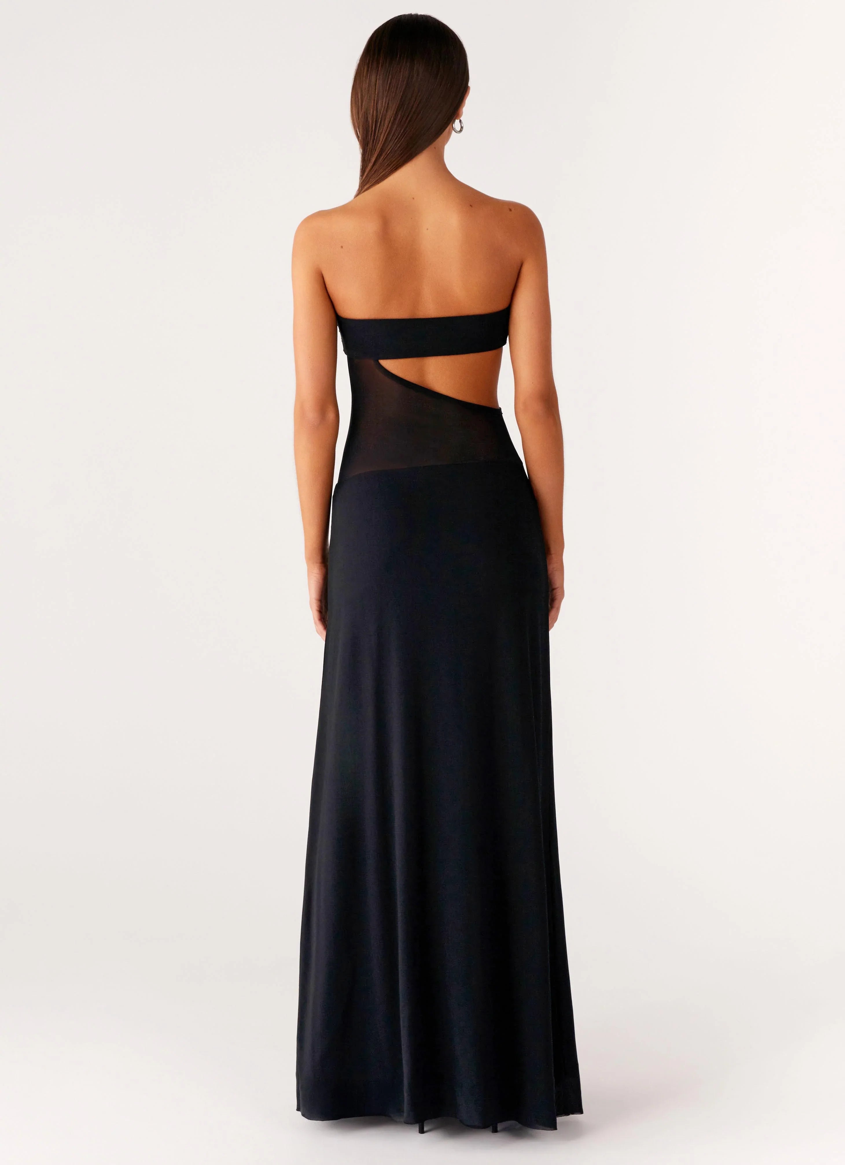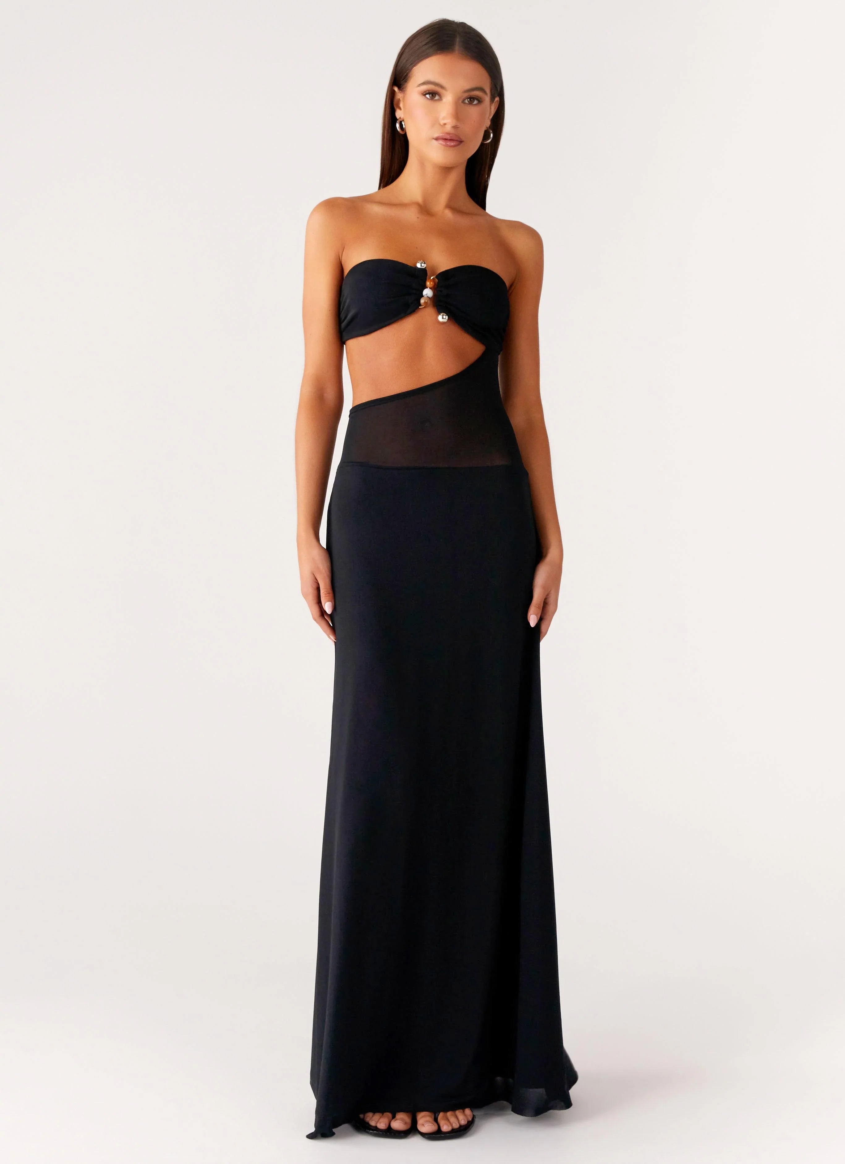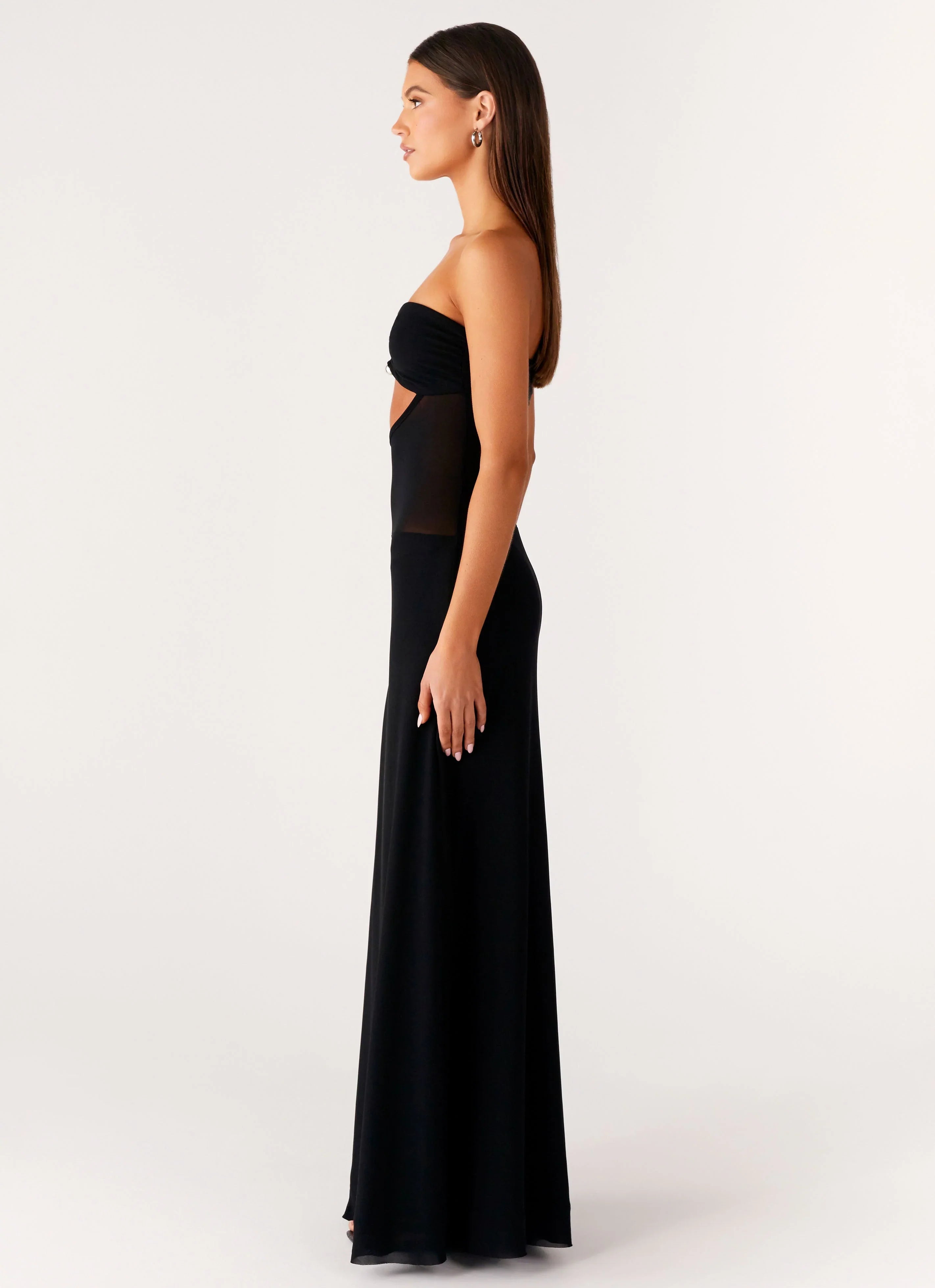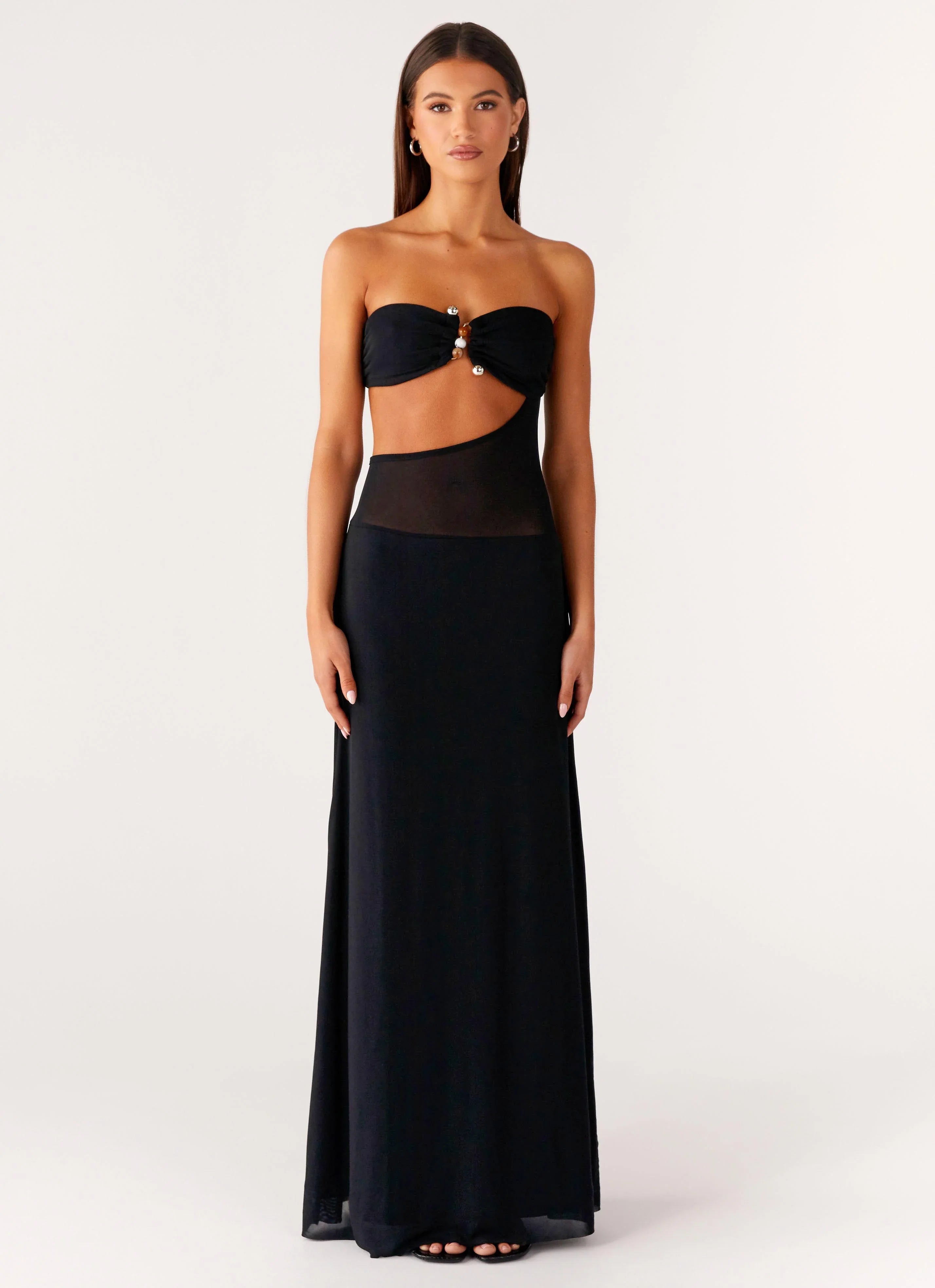 The No Apologies Maxi Dress is made for nights that command attention. Featuring a sweetheart neckline with front metal embellishment, side cut-outs, and a lined bustier and skirt, this stretch mesh maxi also has semi-sheer side panels and silicone neckline taping for a sleek finish.