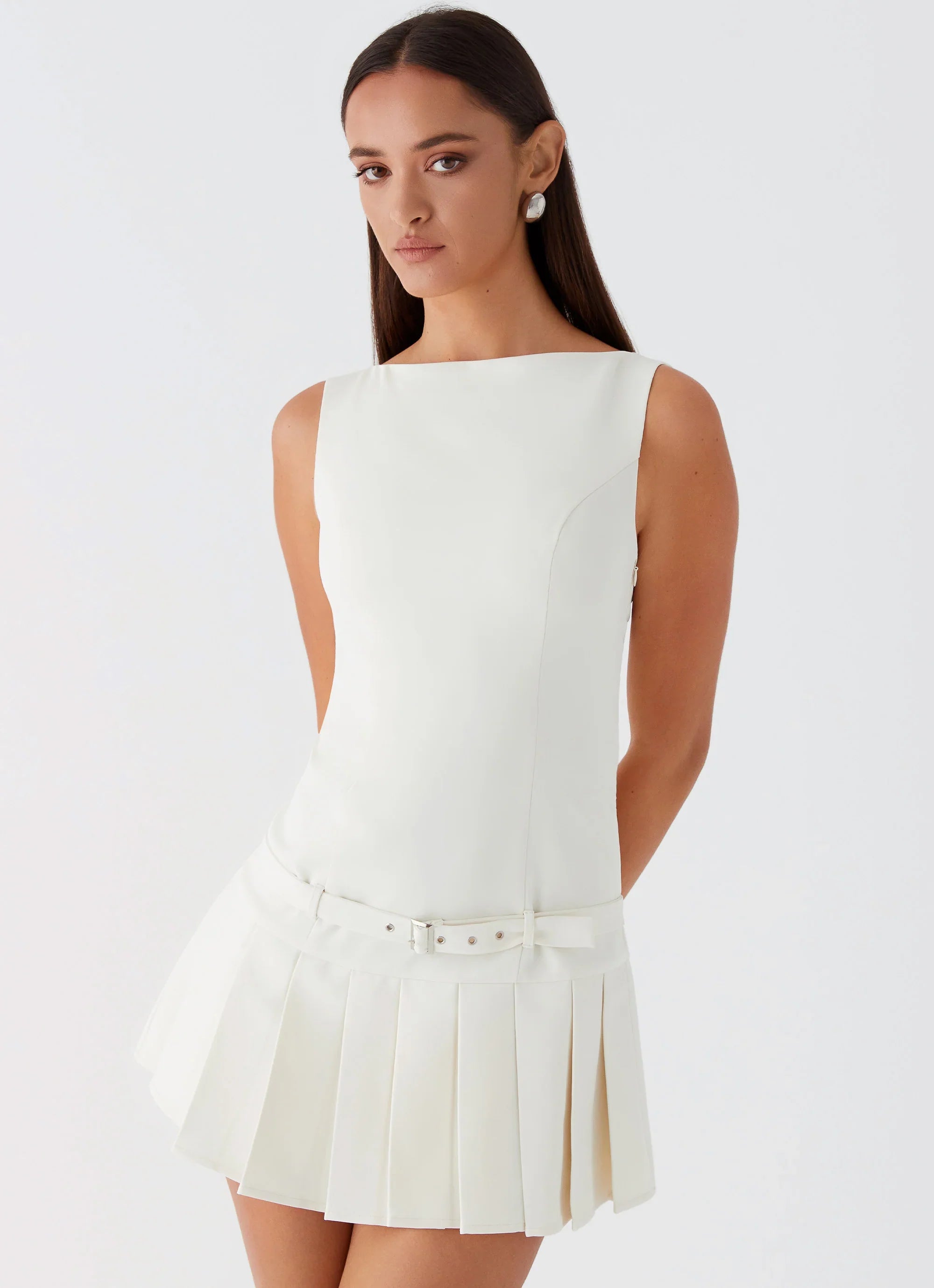 Elevate your wardrobe with the "No More Excuses Mini Dress." Featuring a high wide neckline and sleeveless design, this dress exudes timeless elegance. Its pleated skirt adds a touch of sophistication, making it perfect for both casual outings and evening events.