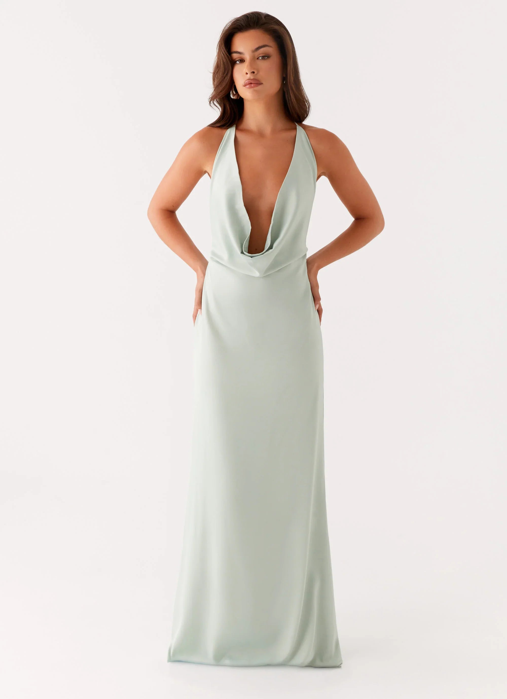 The Noemi Maxi Dress features a striking deep cowl neckline at the front and a seductive low back, creating an effortlessly chic and elegant silhouette. The soft, flowing fabric drapes gracefully to the floor, providing a flattering fit that moves with you.