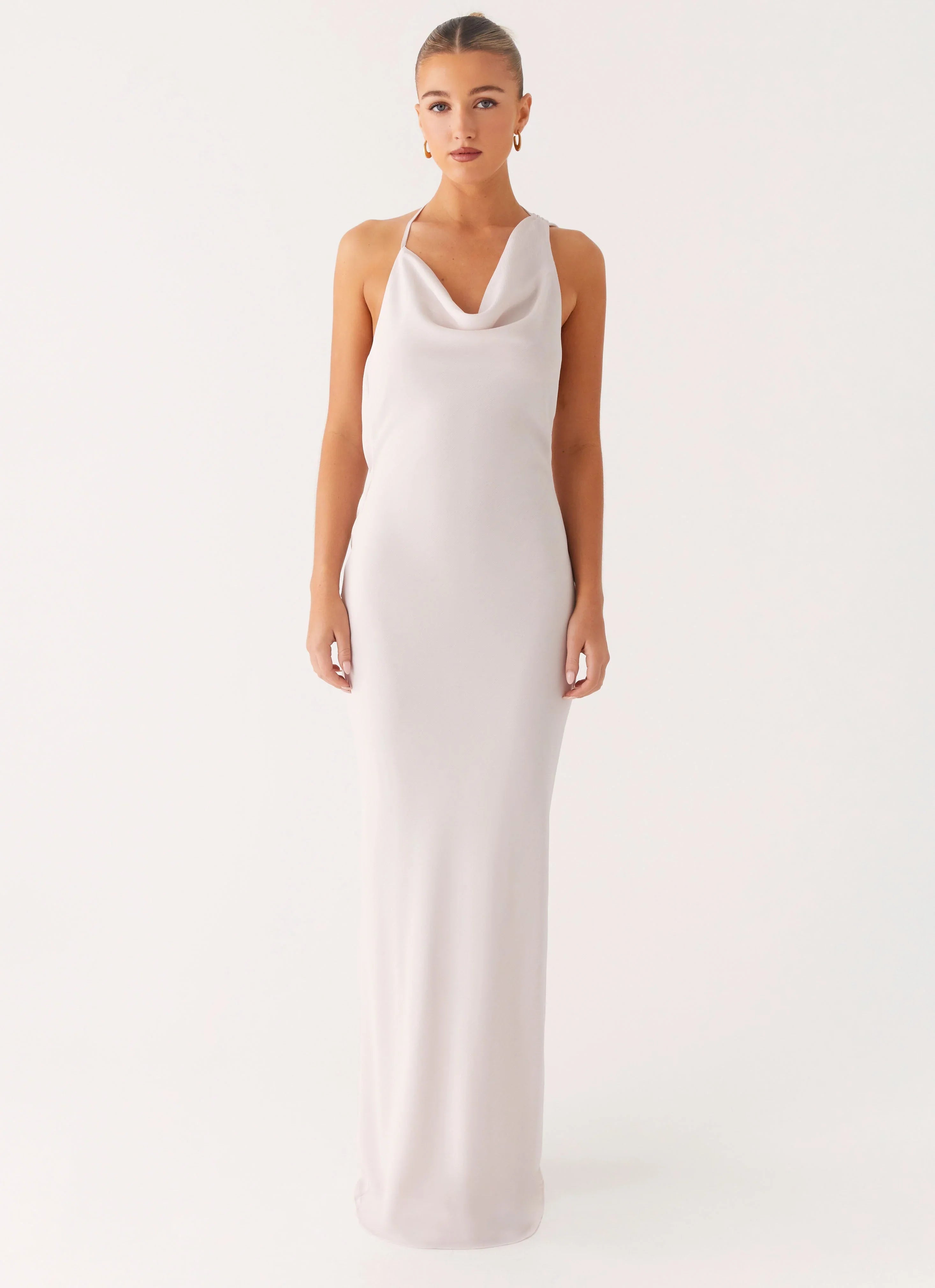 The Opal Glow Maxi Dress is made for golden hour glamour. Crafted in a luxe off-white hue, this silhouette features an asymmetric halter neckline and bias cut that flatters and flows. A draped sash at the low back adds an elegant twist, while the invisible side zipper and full lining keep things sleek and seamless.
