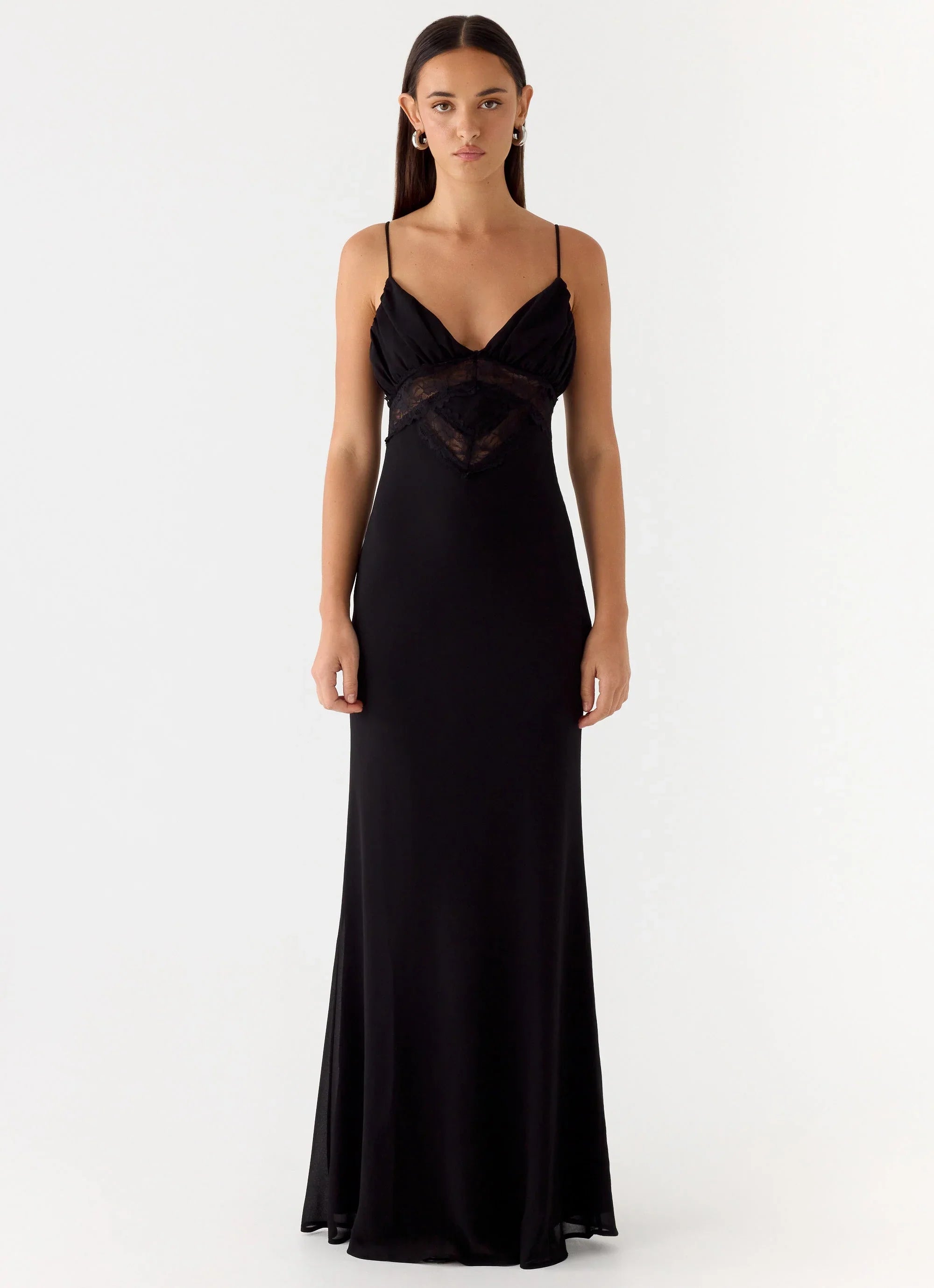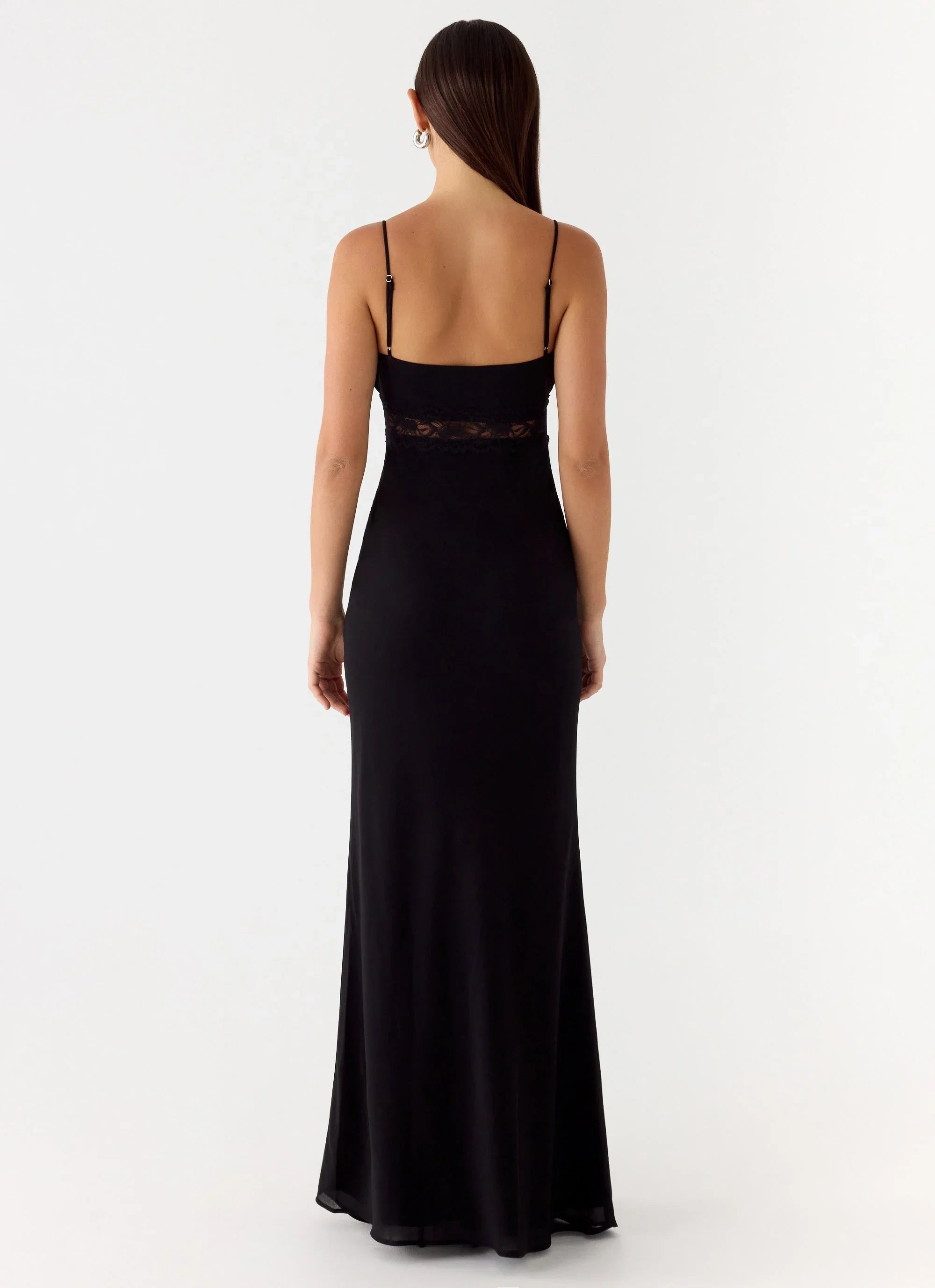 The Opulent Maxi Dress is made for after-dark elegance under glowing city lights. Designed with a flattering V neckline and adjustable straps, this flowing maxi silhouette is elevated with sheer lace detailing for a striking, feminine finish. It’s the perfect balance of sultry energy and refined glamour for unforgettable nights.