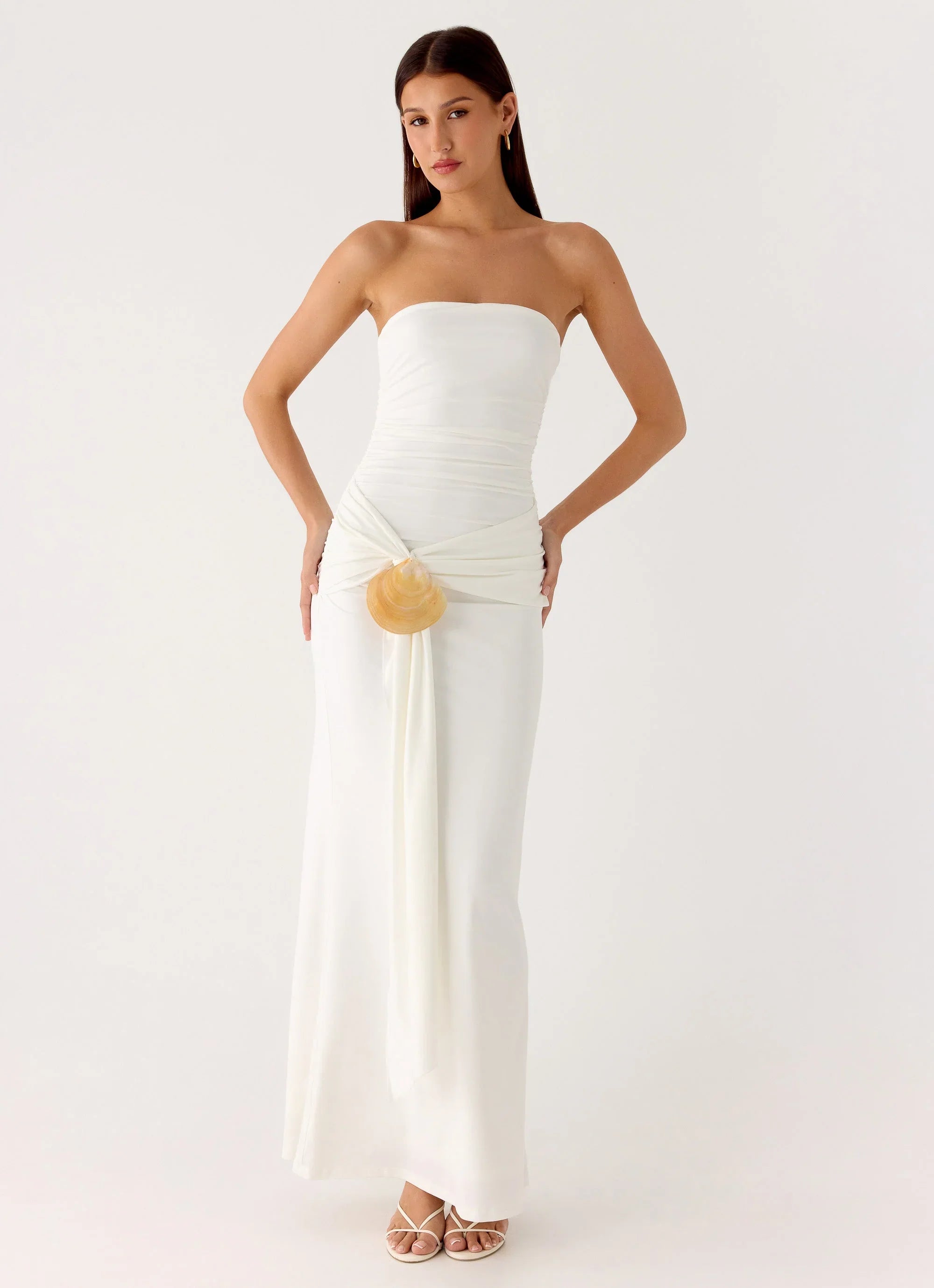 The Party After Party Shell Maxi Dress is perfect for nights that shimmer under city lights. With a strapless neckline, adjustable straps, and a front tie sash, this stretch jersey maxi dress features ruched sides, a shell detail, and a flowy silhouette that moves with you from sunset to sundown.