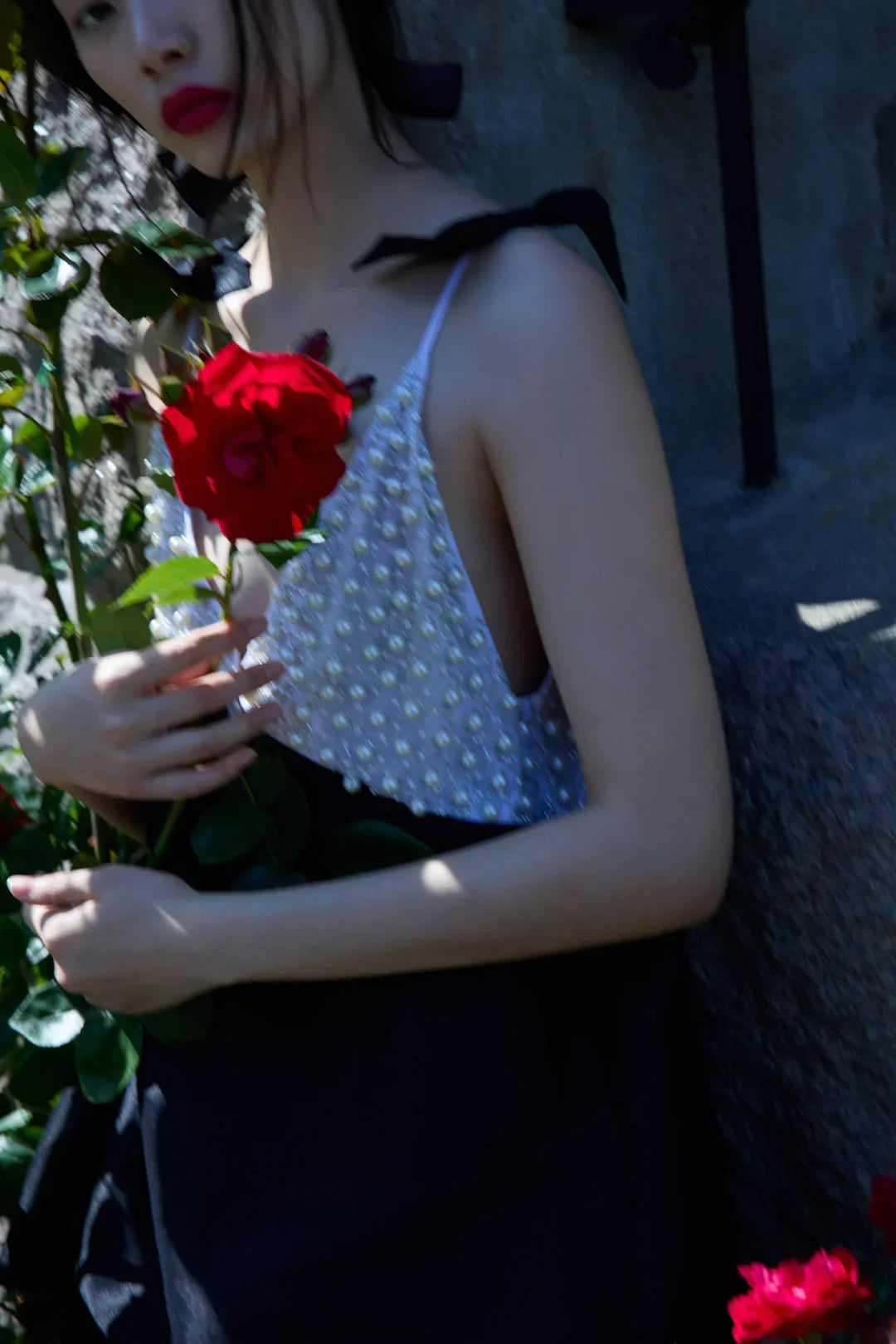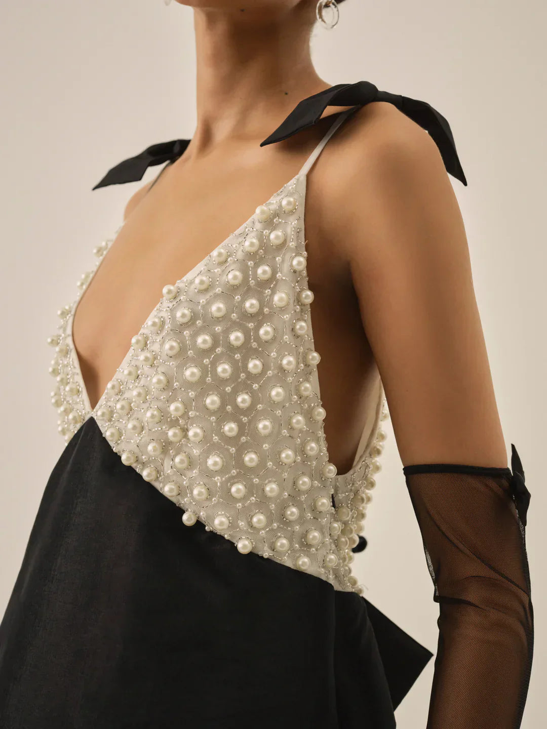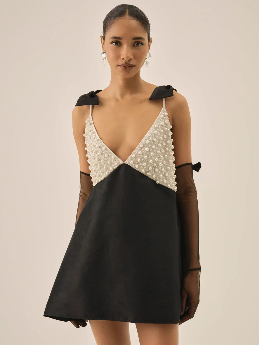 Designed for the season's most glamorous soirées, the Pearly Bow black mini dress is a true show-stopper. Featuring a plunging neckline at the front and back with fixed satin bows at the shoulders, this little black dress spotlights pearly embellishments at the cups and a contrast black satin skirt. This black dress comes with coordinating elbow length mesh gloves adorned with satin bows.