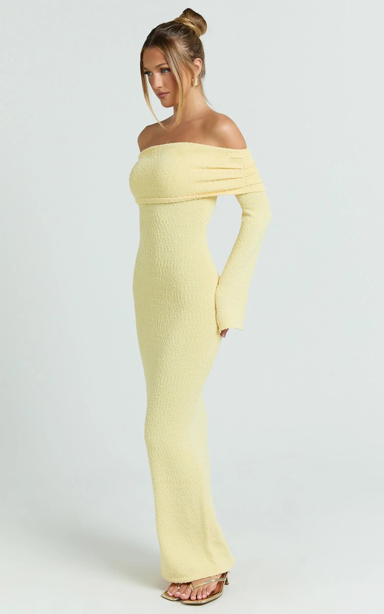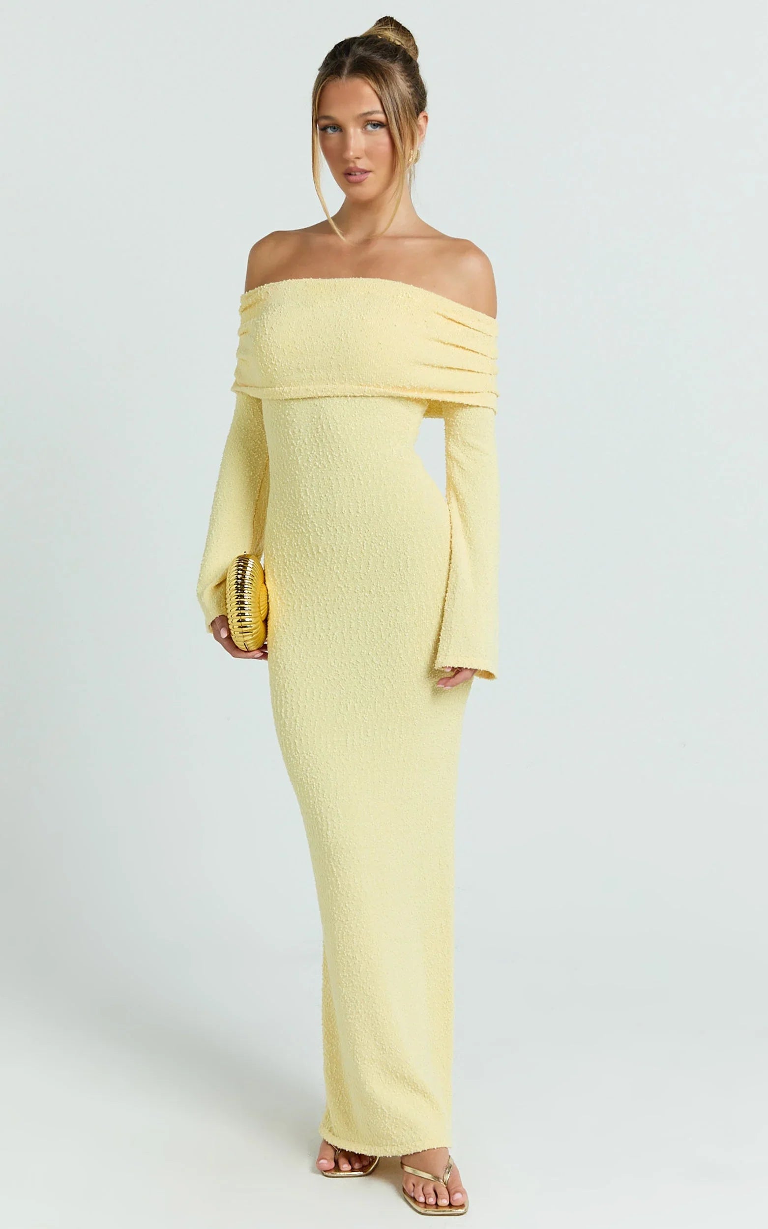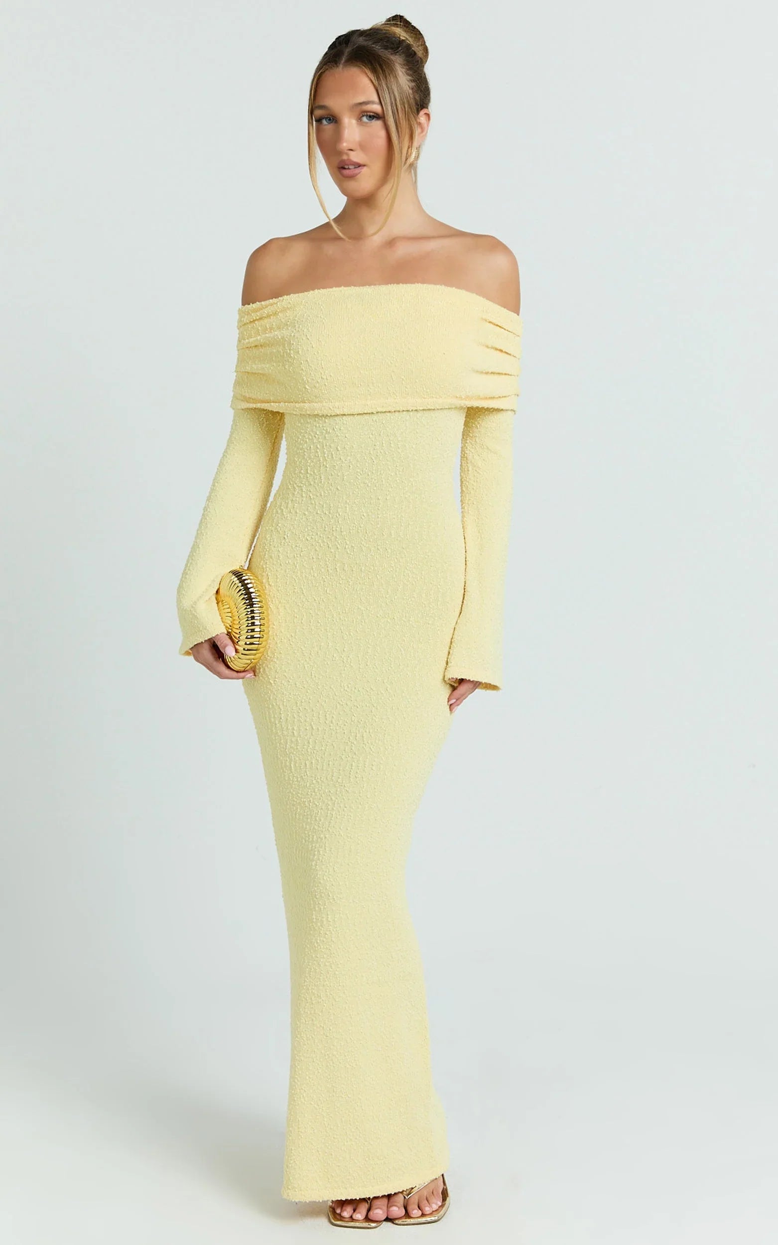 The lemon hue pops for weekend dates, long lunches and occasion moments, while the elegant neckline shows just the right amount of shoulder. Think easy glam with a playful twist, perfect for the season of breezy dresses.