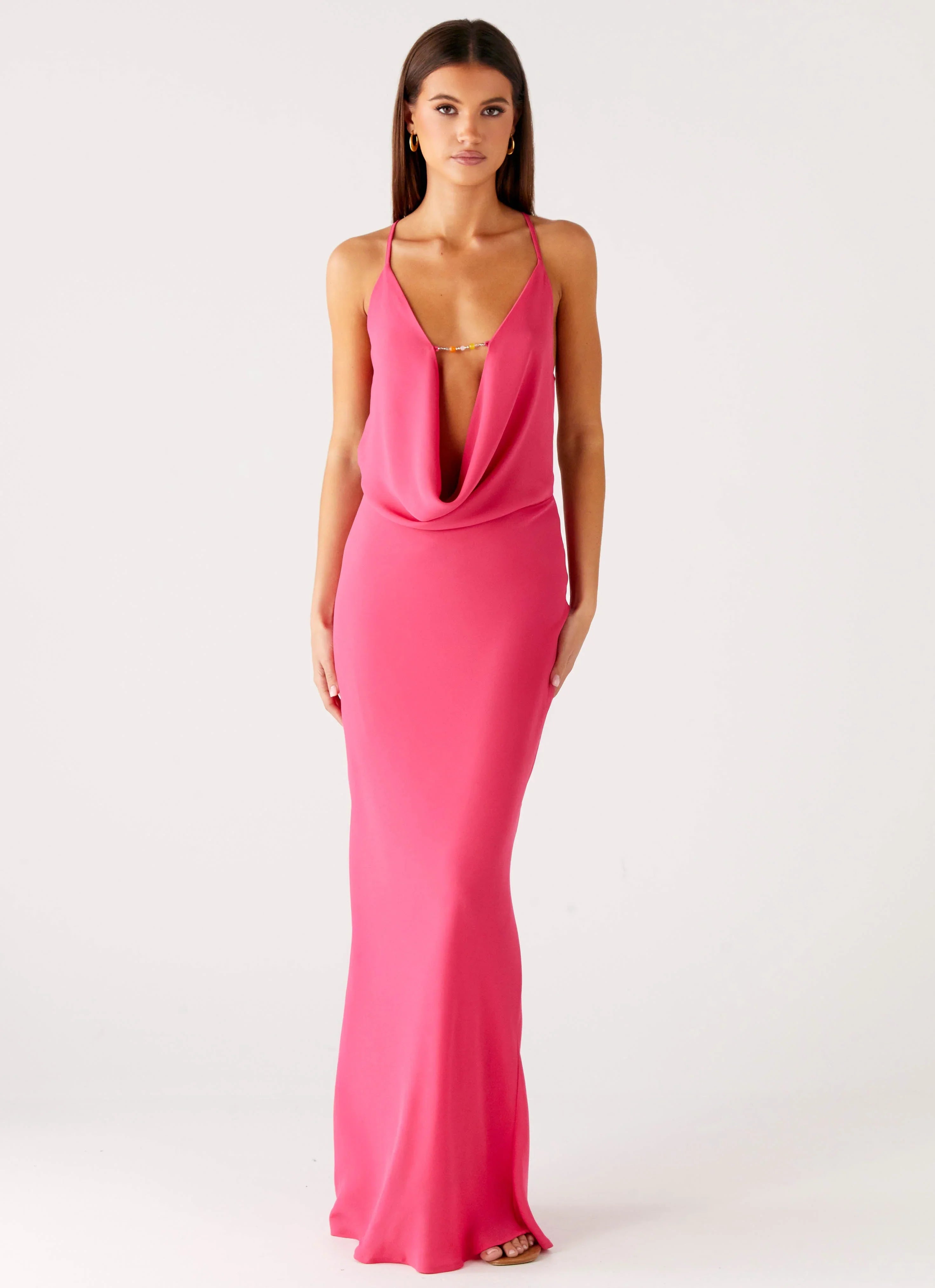 The Pure Heart Cow Maxi Dress is made for nights that never fade. Featuring a low front cowl neckline with delicate front beadings and thin adjustable straps, this maxi dress blends softness and shimmer. With a low back, stretch mesh fabric, and full lining, it’s your perfect partner from golden hour to after hours.
