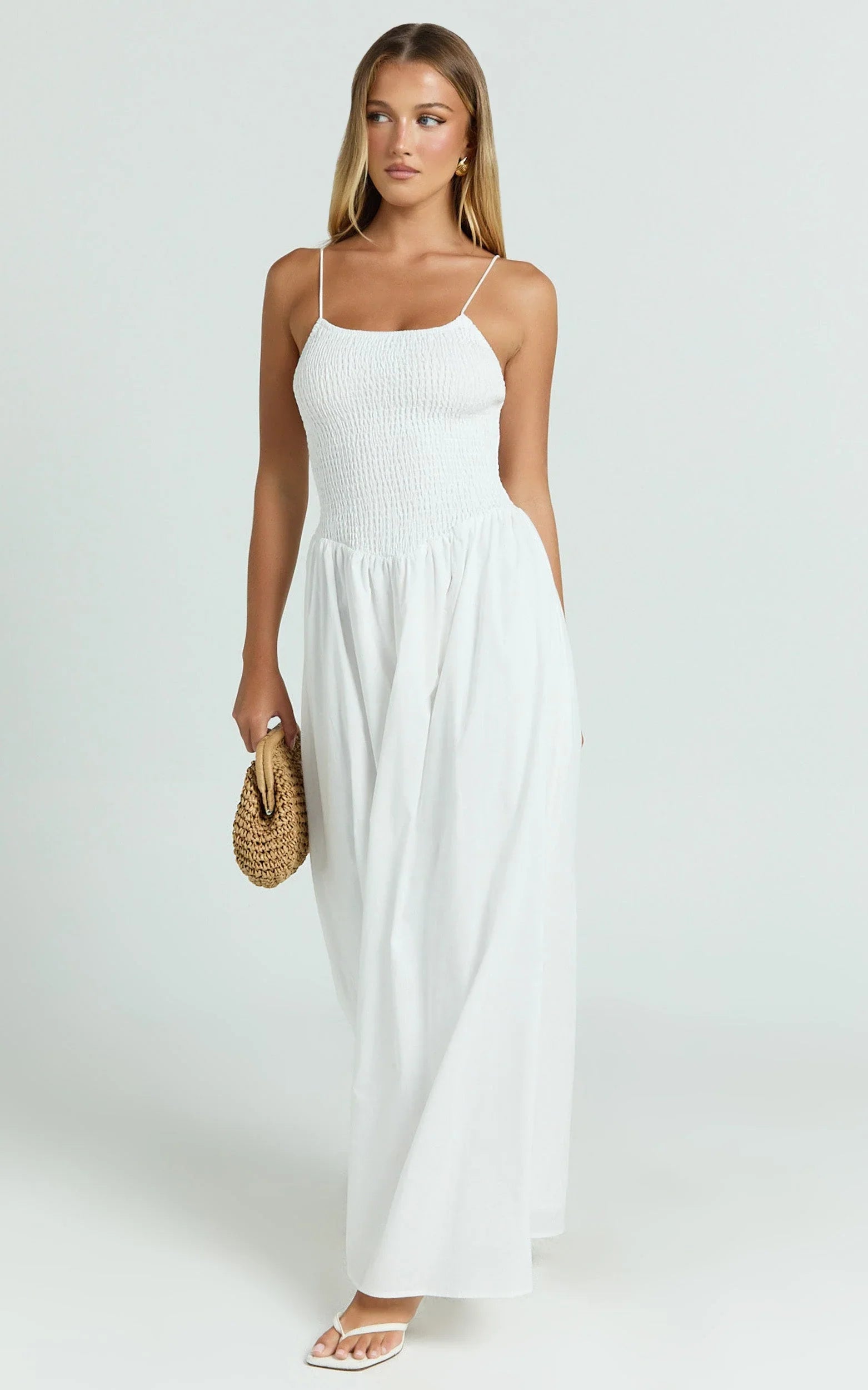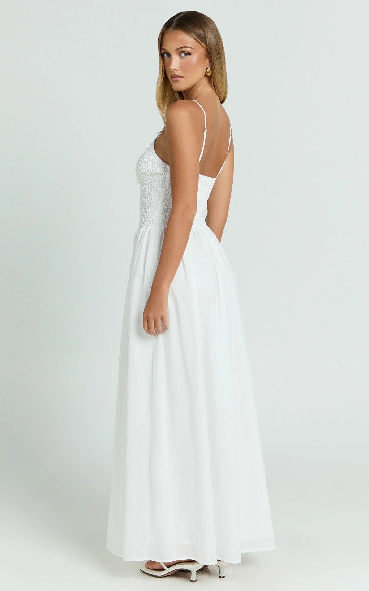 The figure-loving bodice and floaty maxi hem make it an easy yes for beach dates, long lunches and evening dress moments. White keeps it fresh and versatile, while the delicate shirring adds comfort and shape that moves with you.