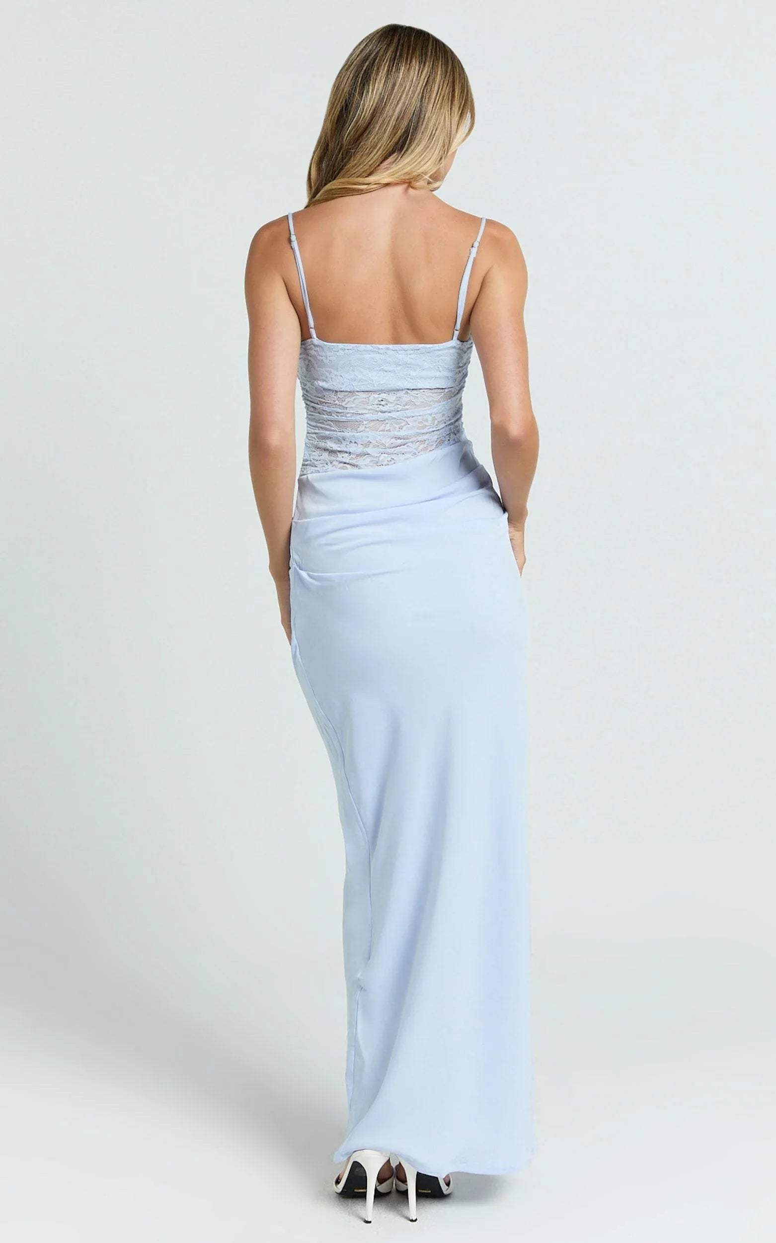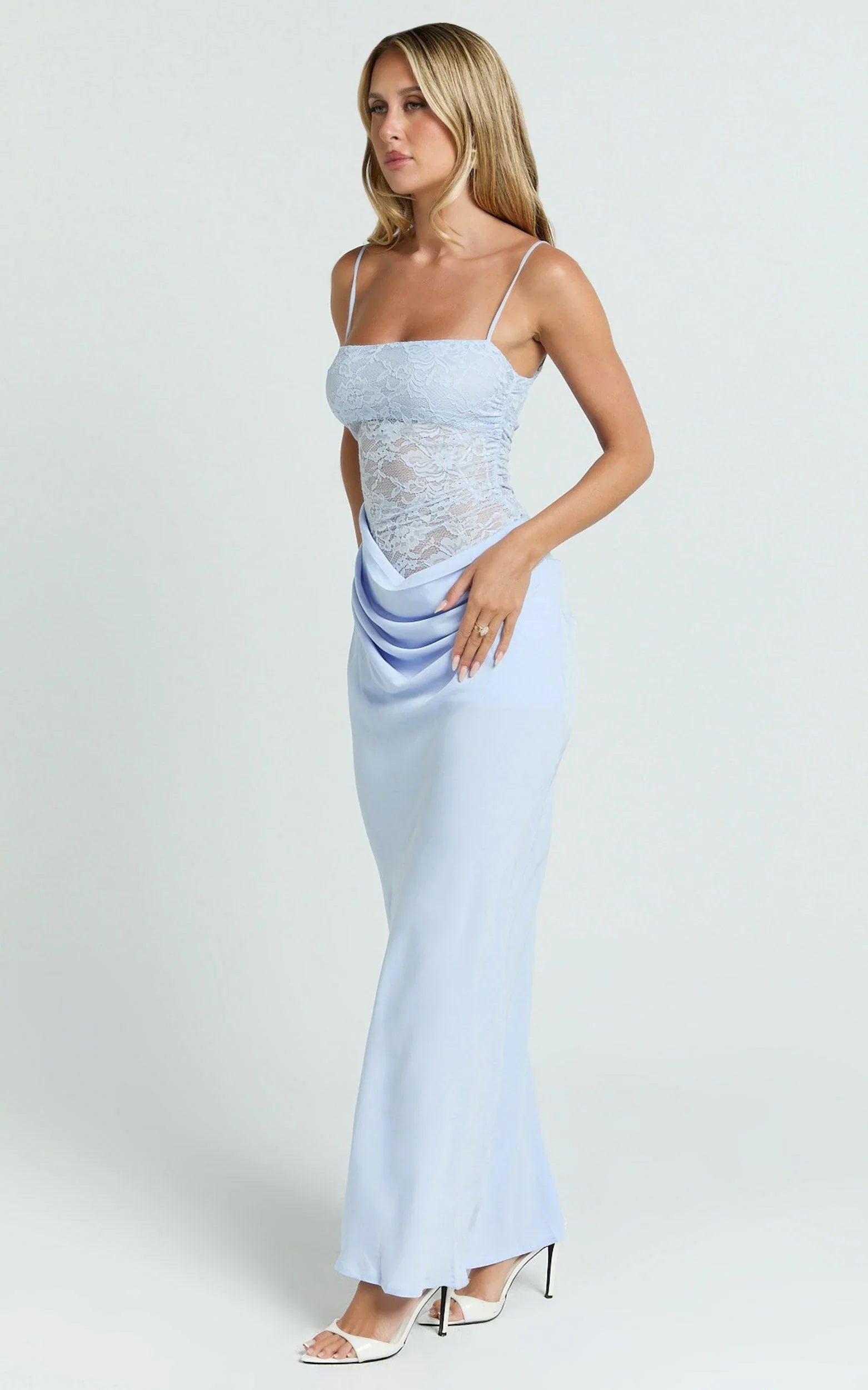 Rania Maxi Dress - Contrast Lace Bodice Bias Cowl Drop Waist Dress In Soft Blue levels up your Dresses rotation with a dreamy blue hue and waist-accentuating shape that photographs beautifully. Take it from ceremony to sunset with barely-there heels and delicate jewellery for an Old Money aesthetic finish, minimal, polished, and totally timeless.