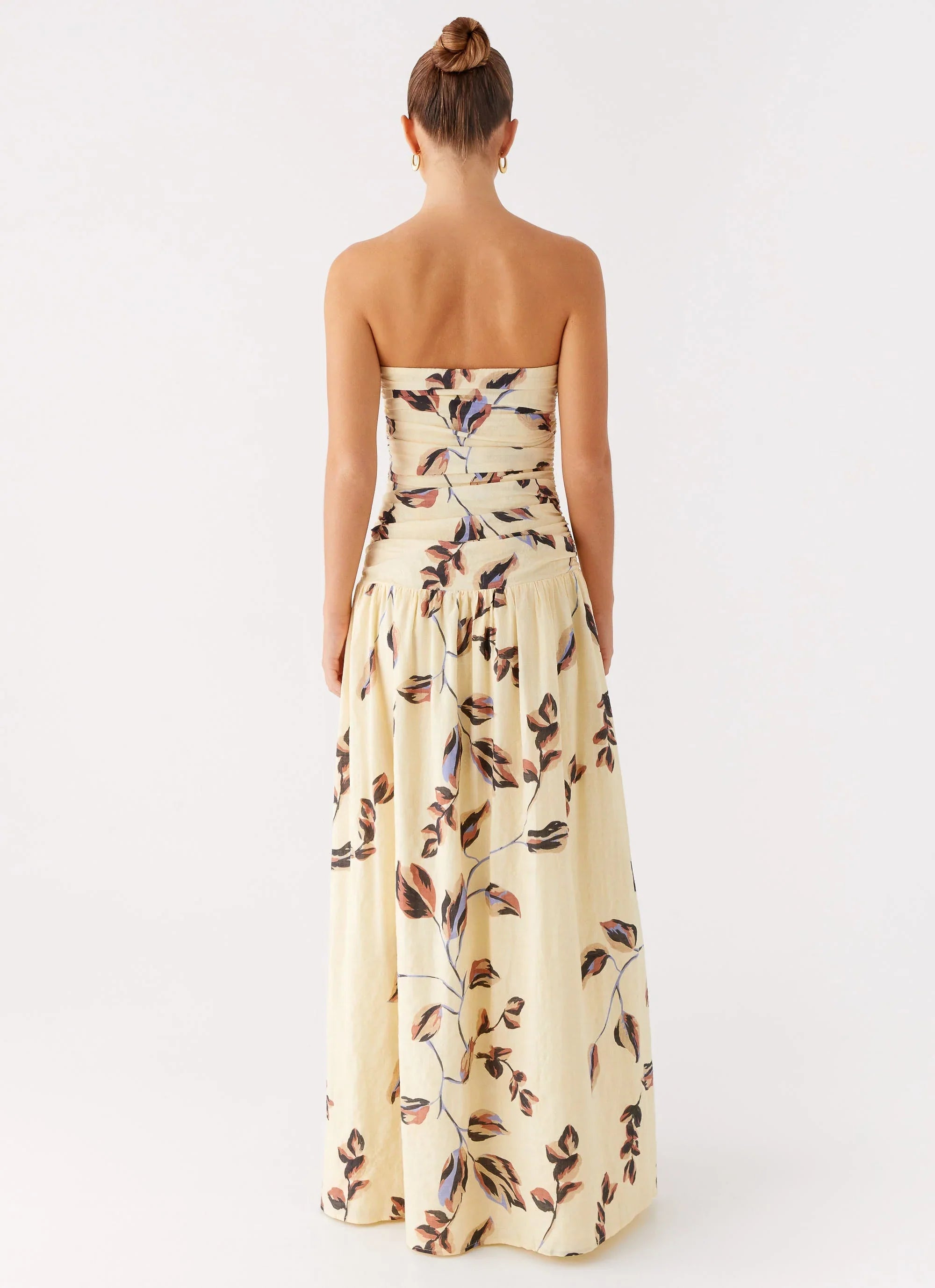 The Rhea Ruched Maxi Dress flows effortlessly from sunset to late night with ruched detailing, floral print and a fully lined silhouette designed to move with you under golden skies.