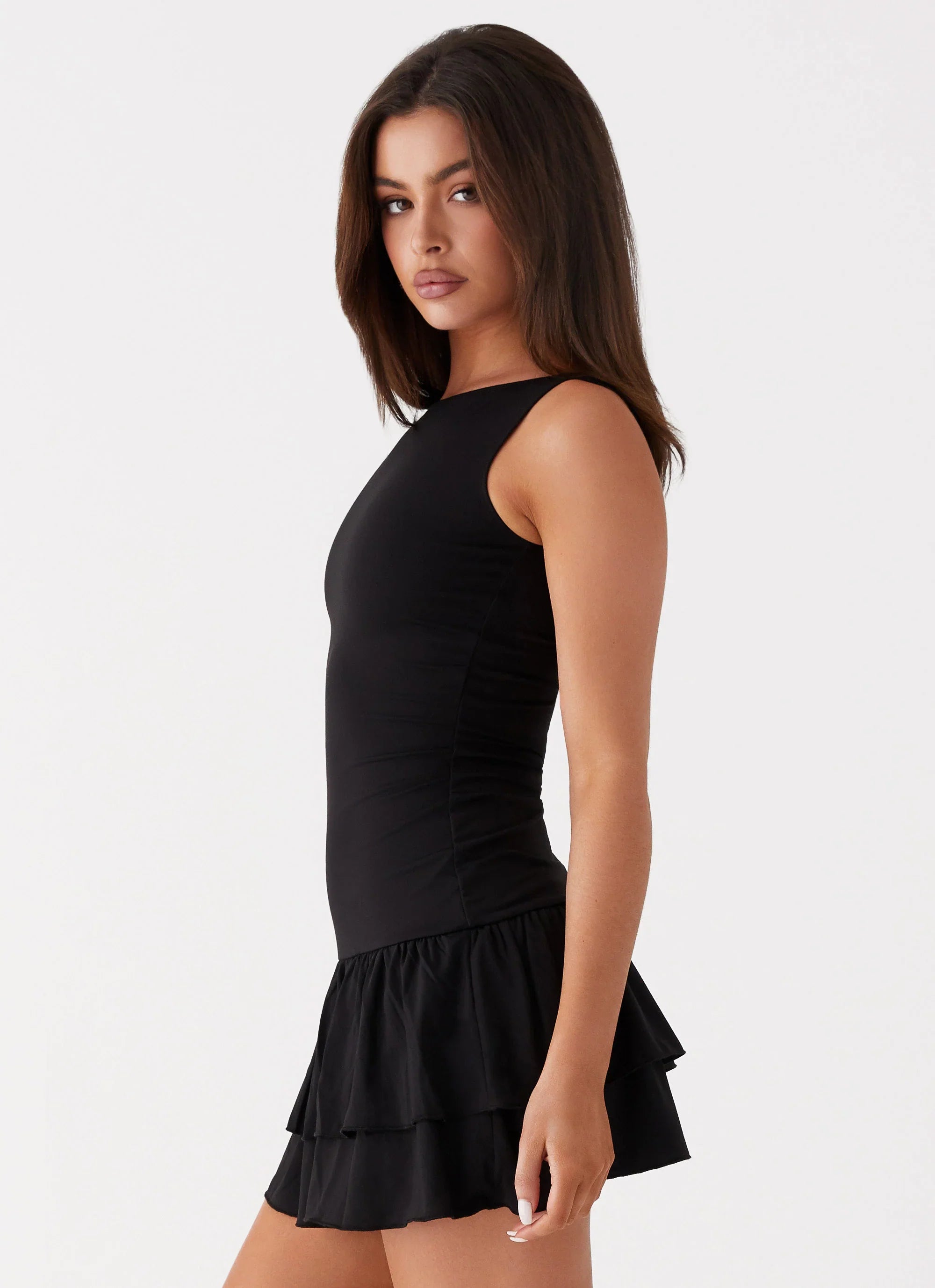 Step into elegance with the Rhiannon Frill Mini Dress. Featuring a high wide neckline, sleeveless design, and drop waist, this dress effortlessly blends feminine charm with playful sophistication.