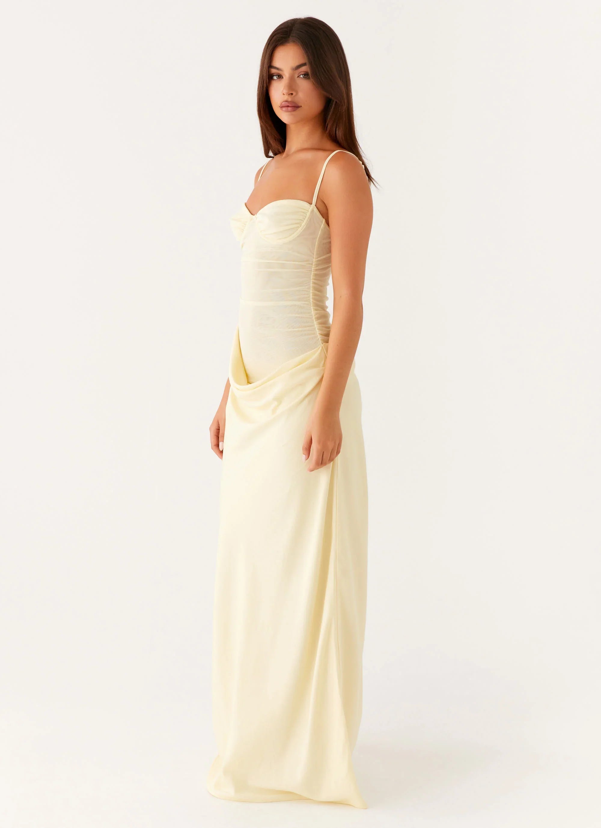 The Romy Maxi Dress is a stunning and structured piece, featuring underwired support for a flattering fit and gathered skirt detailing that adds texture and movement.