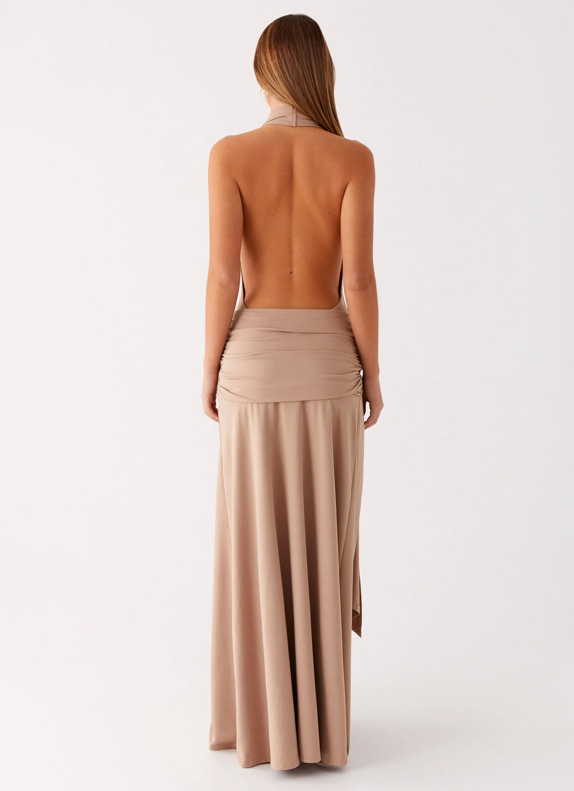 The Rowan Ray Cowl Maxi Dress features a flowing maxi length with a low cowl neckline and thick neck tie strap. Crafted from stretch jersey, it includes front tie detailing, a front side split, a low back, and is self-lined for comfort.