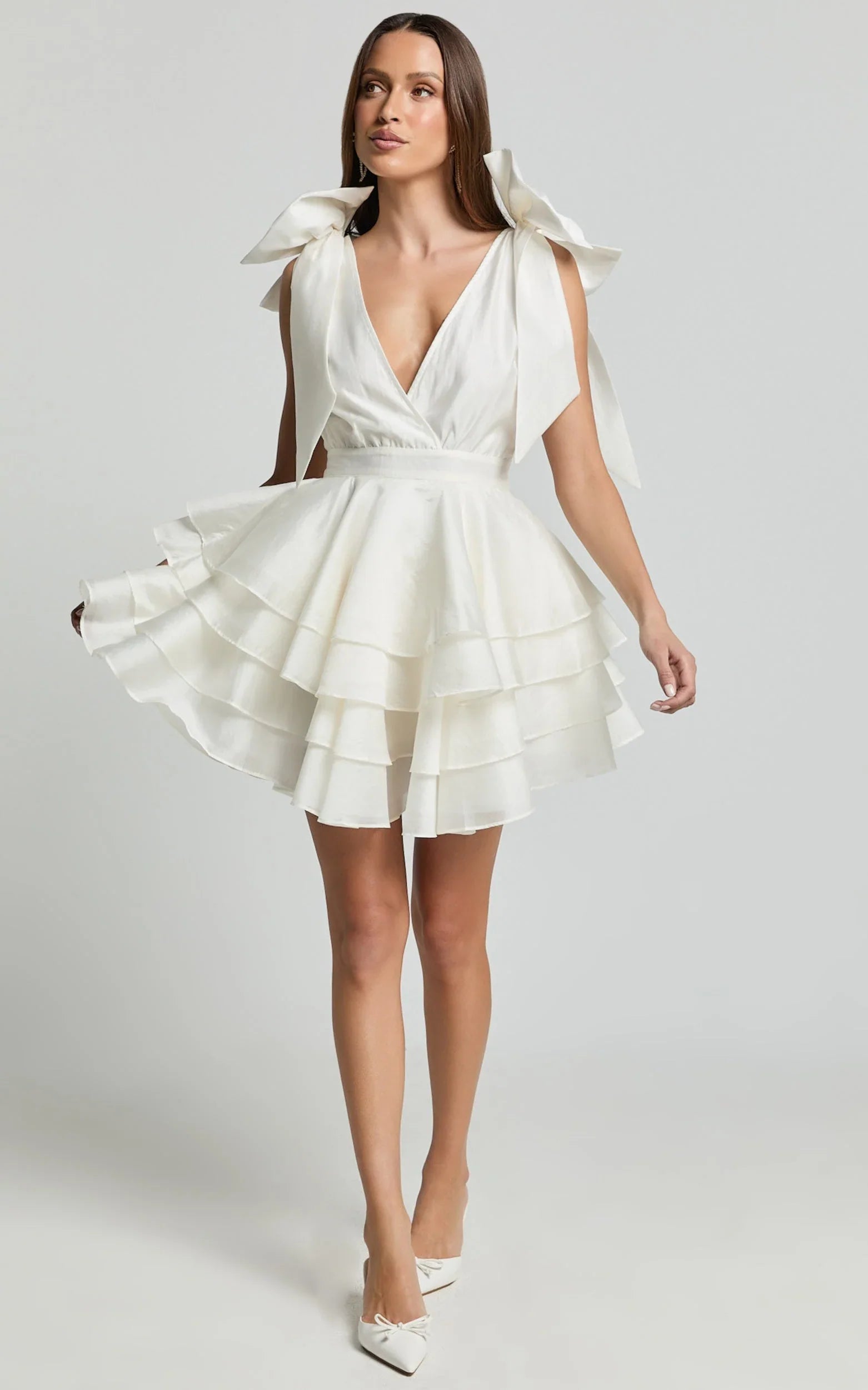 Make a statement in the Roxanne Mini Dress, where fashion meets the ultimate form of self-expression. Embodying the essence of inclusivity and empowerment, this shoulder tie plunge ruffle dress in pristine white is more than just a piece of clothing; it's a declaration of confidence and grace. Designed with the spirited Gen Z and millennials in mind, the Roxanne is a perfect symphony of traditional and trend-setting.