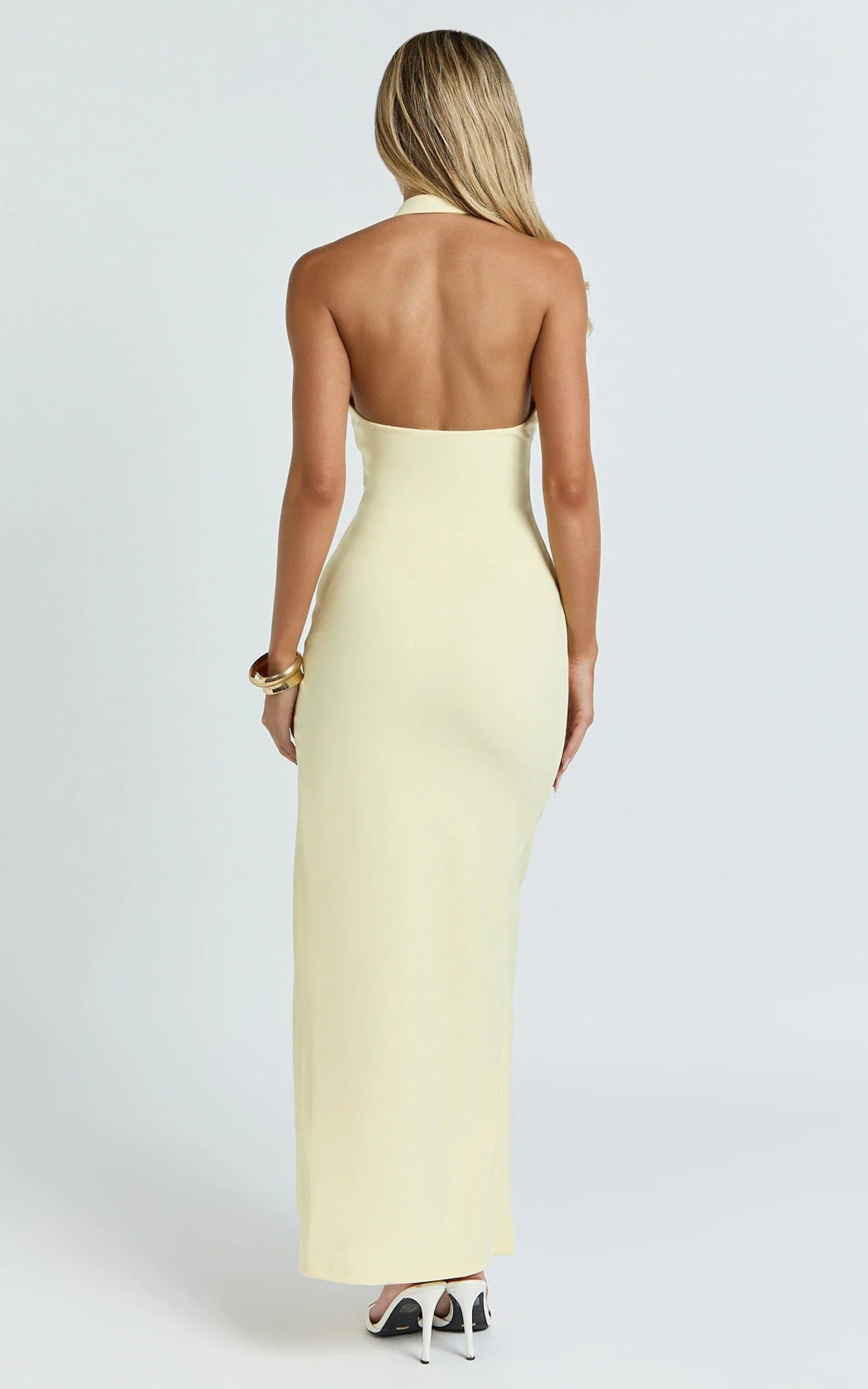 This halter scoop neck, low-back bodycon serves effortless allure with a sleek, elongating maxi cut made for golden-hour plans and dance-floor moments. The fit is smooth, flattering, and confidence-boosting, think party-ready energy with a refined twist.