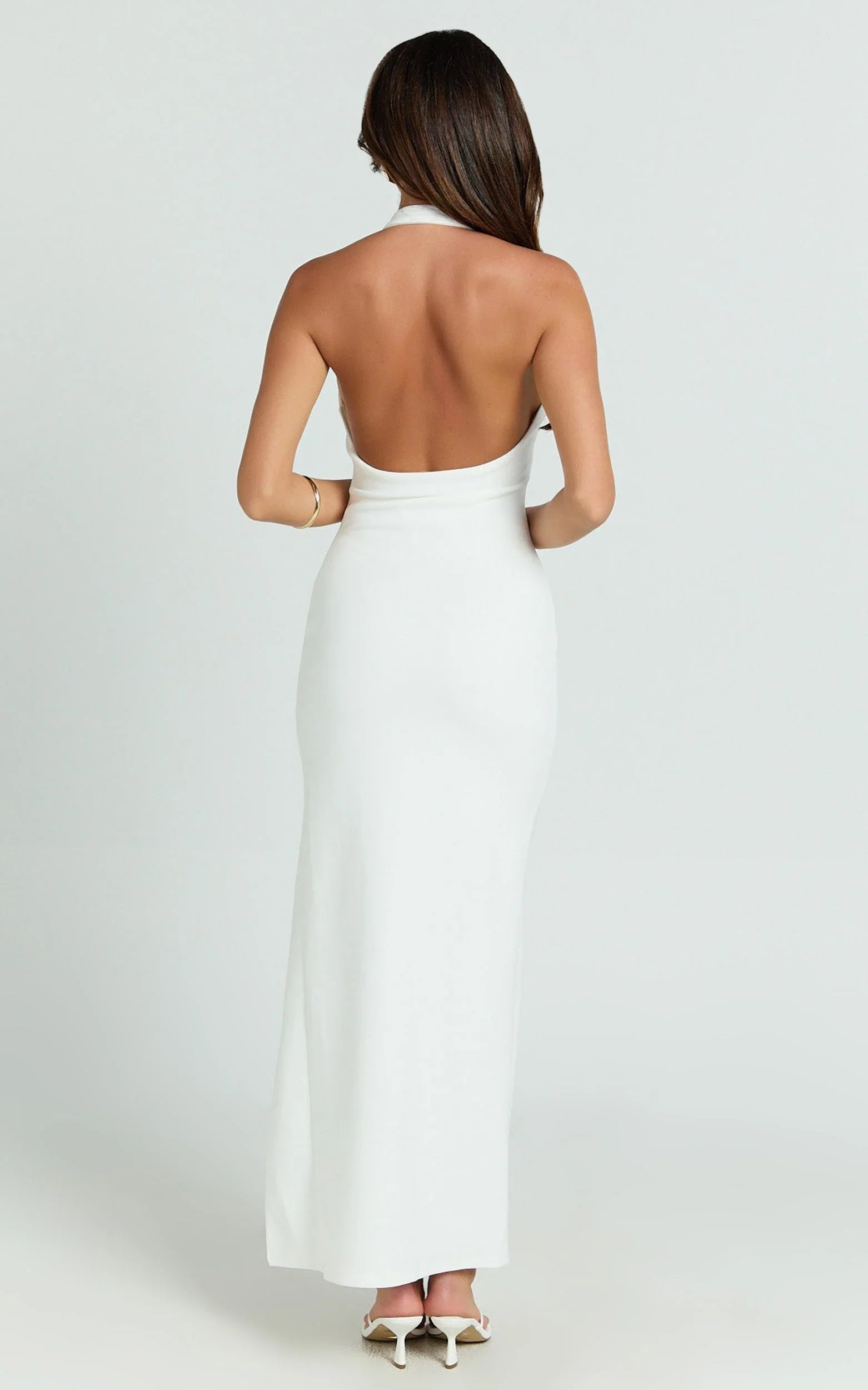 This white maxi hugs in all the right places with a halter scoop neck, sleek bodycon fit and a sultry low back that turns every exit into a moment. Effortlessly elegant for brides-to-be, long lunches and rooftop plans, it’s a timeless canvas that lets your accessories do the talking.