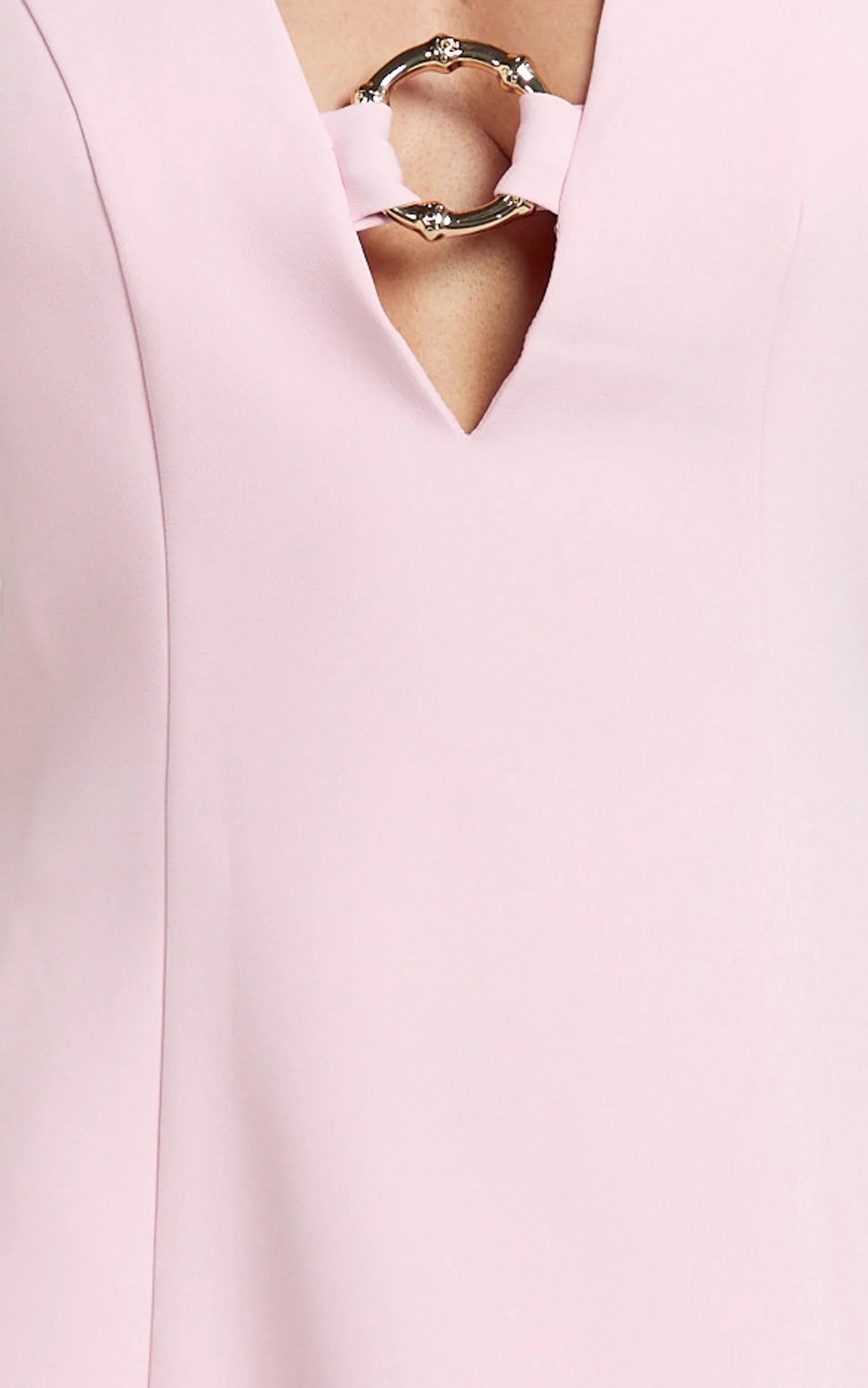 This pink mini cinches the waist and flares just right, while a plunging O-ring neckline serves major party energy. Think twirl-worthy movement with a fit-and-flare silhouette that flatters from every angle, perfect for rooftop drinks or dance-floor moments.