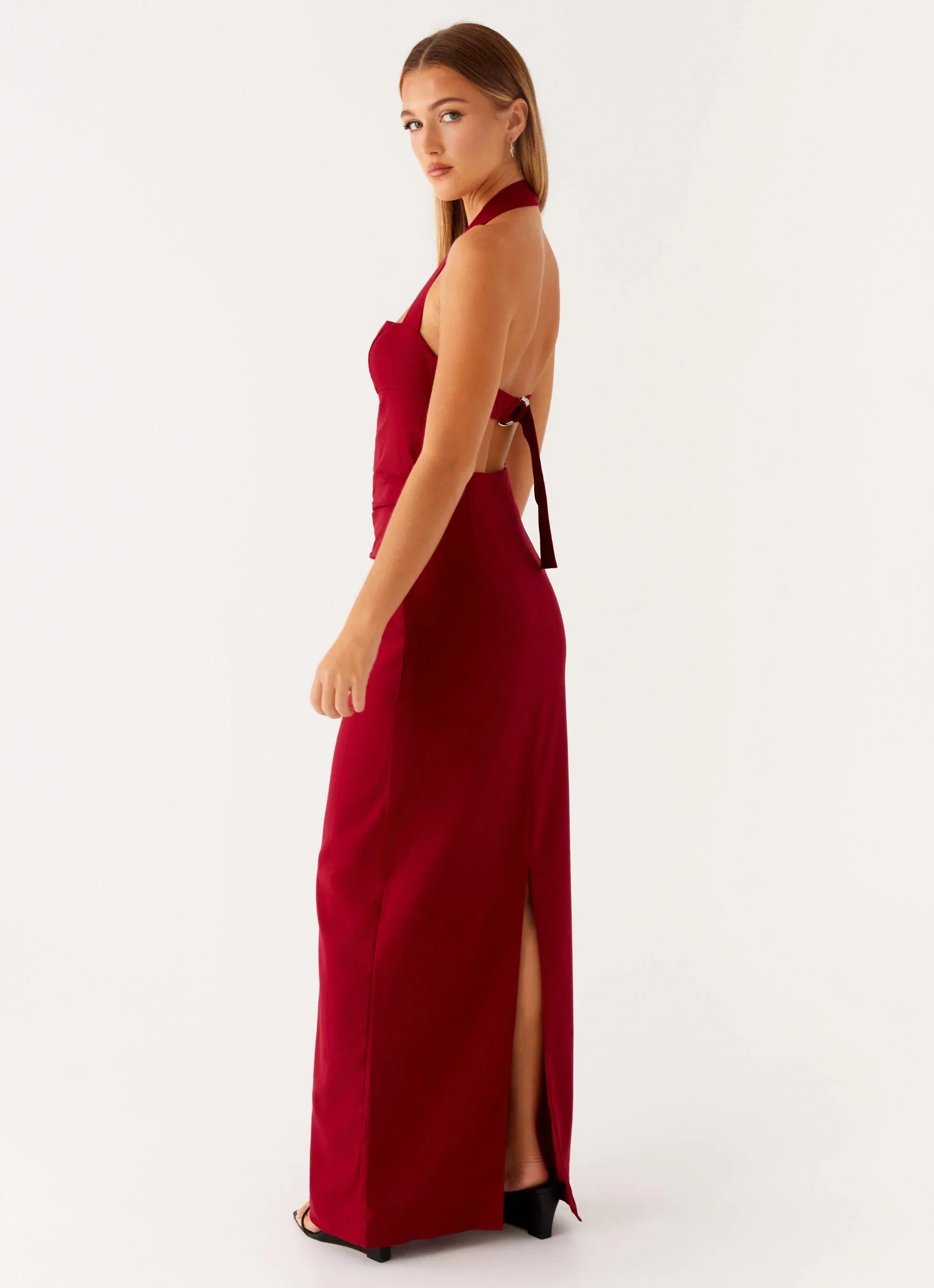The Rumour Has It Maxi Dress is made for nights that leave a mark. Crafted from sleek satin with a halterneck, button front, and flowing silhouette, it’s a bold red statement built for the spotlight.