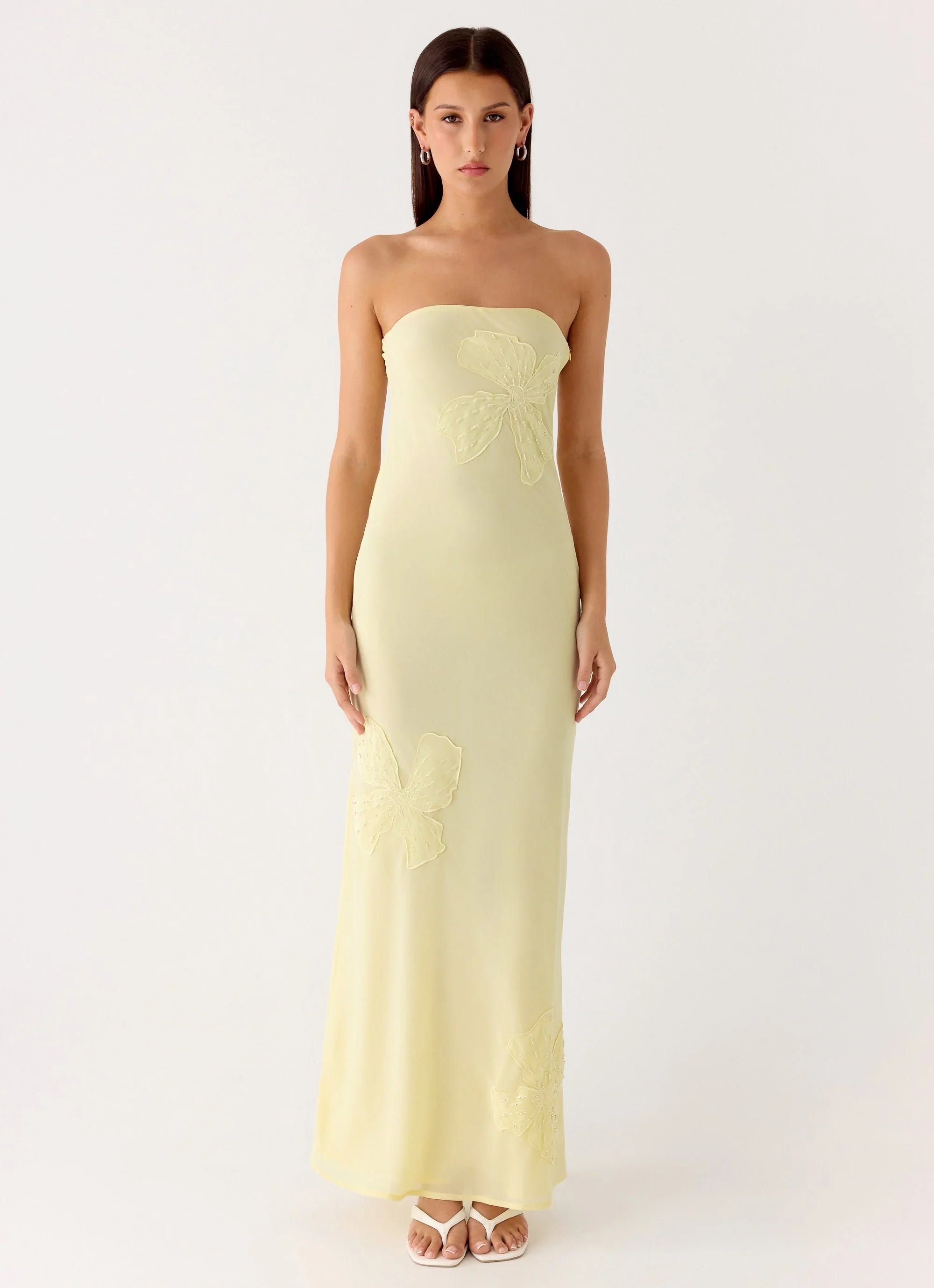 The Sassafras Beaded Flower Strapless Maxi Dress is a stunning bodycon style featuring a strapless neckline and delicate beaded flower embellishments, finished with silicone taping for a secure fit.