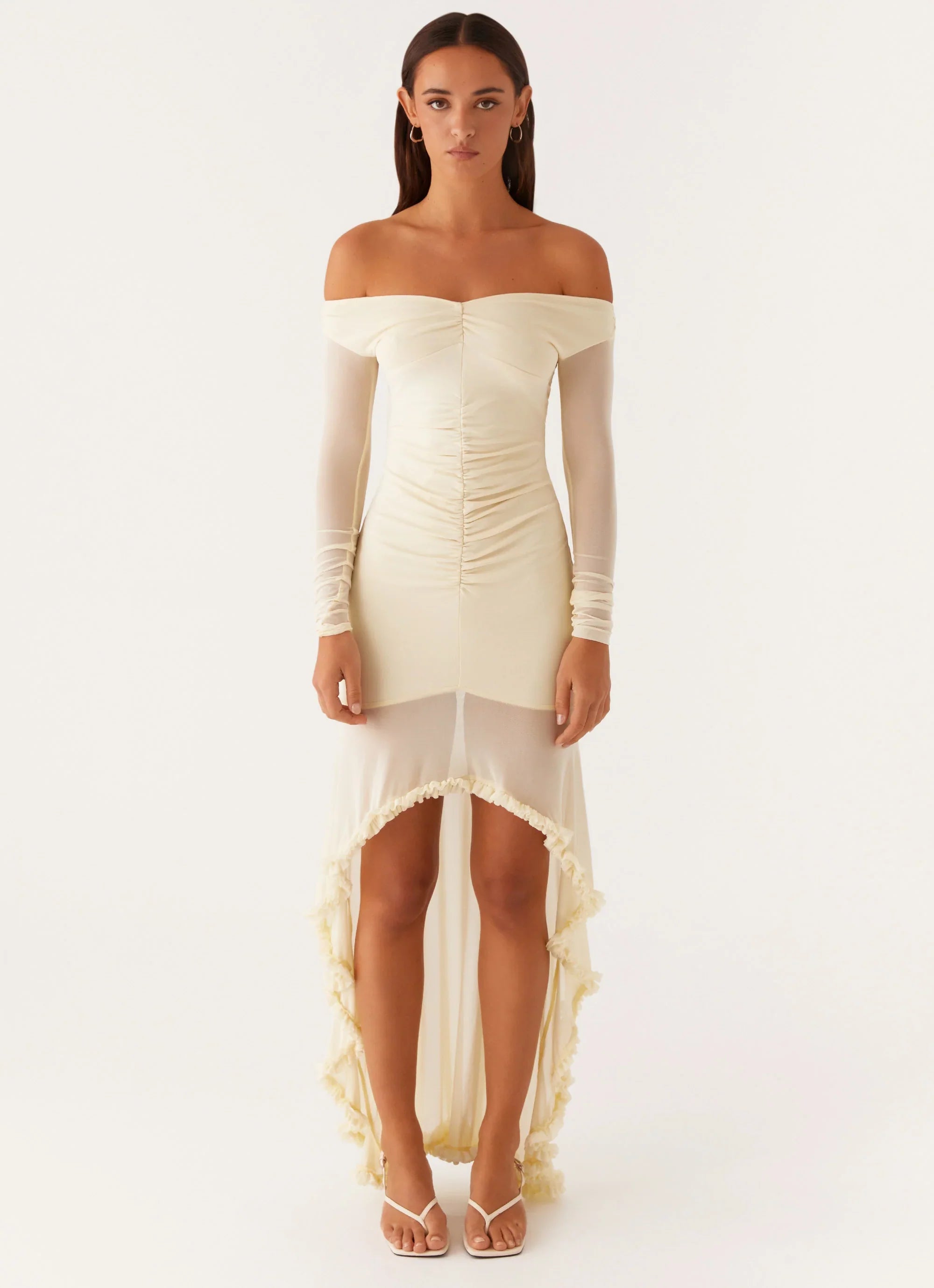 The September Sun Maxi Dress exudes effortless elegance with its off-shoulder neckline that beautifully frames the shoulders. Crafted from stretch mesh, this dress offers a flattering fit while the semi-sheer straps add a delicate touch.