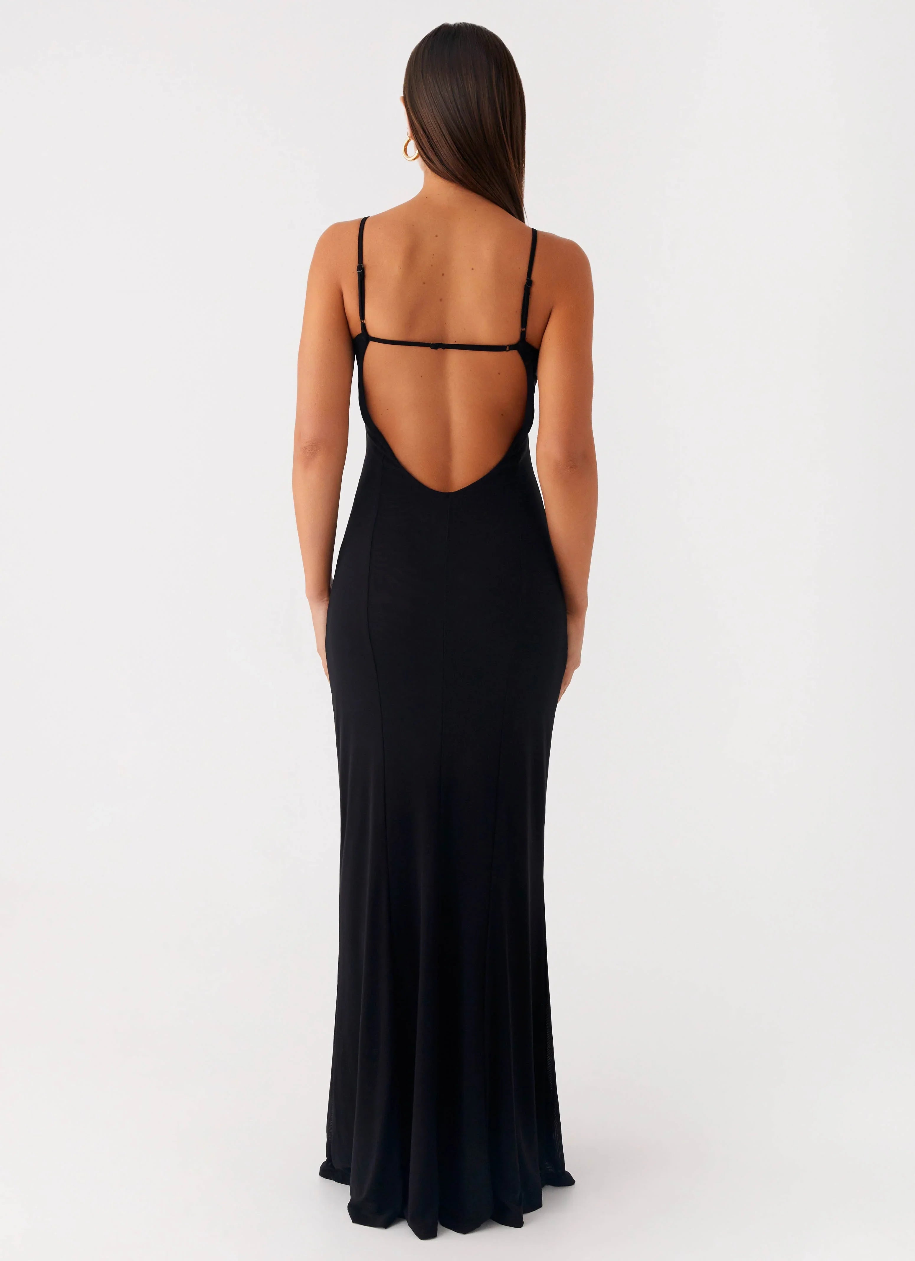 The Serene Escape Maxi Dress is a body-hugging silhouette in semi-sheer stretch mesh, featuring a flattering V neckline and low back. Fully self-lined for comfort, this maxi-length dress blends elegance with subtle allure.