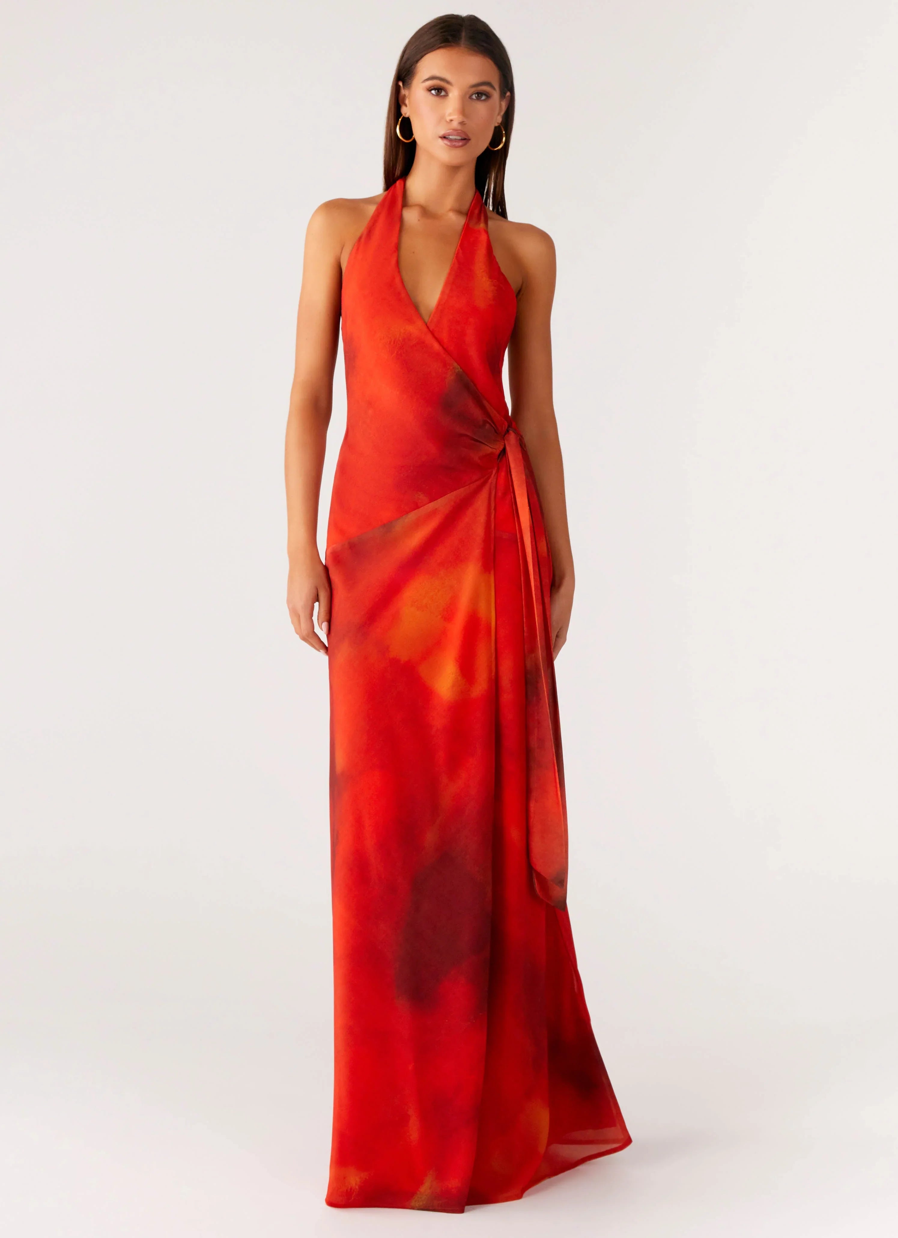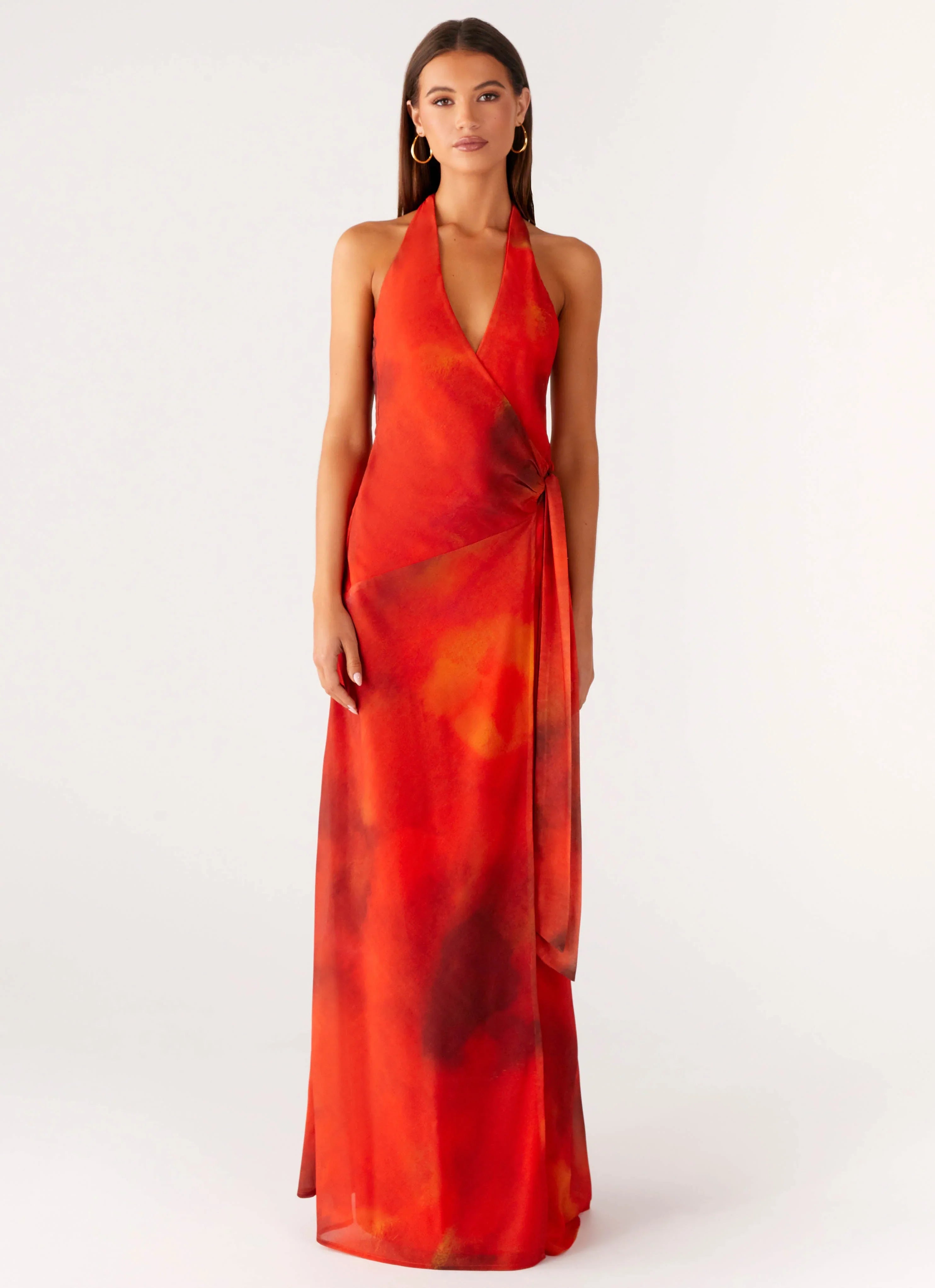 The So Chic Maxi Dress is made for nights that sparkle. Featuring a V neckline with front wrap and tie neck elastic strap, this chiffon maxi dress is fully lined and finished with an open back and front side split.