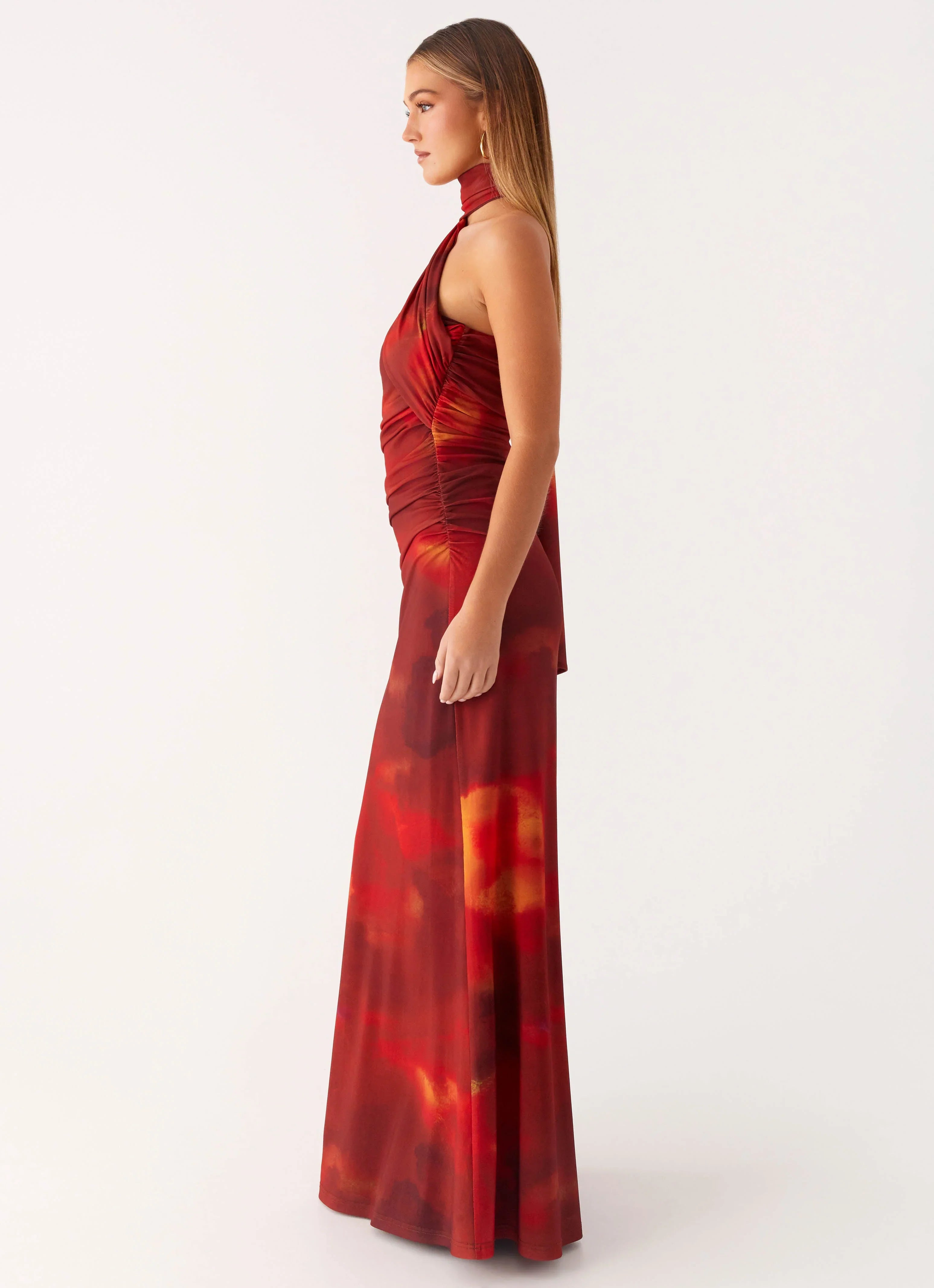 The Songbird Maxi Dress is made for magical nights and golden hour moments. Featuring a strapless neckline and ruched sides, this fully lined stretch mesh maxi is finished with a thick tie-around scarf in our exclusive Scarlet Blur print.