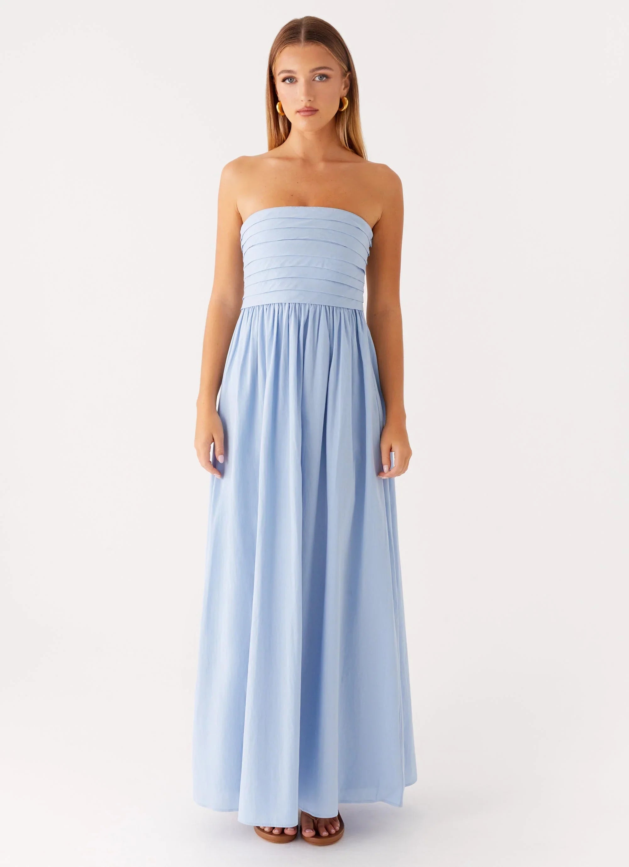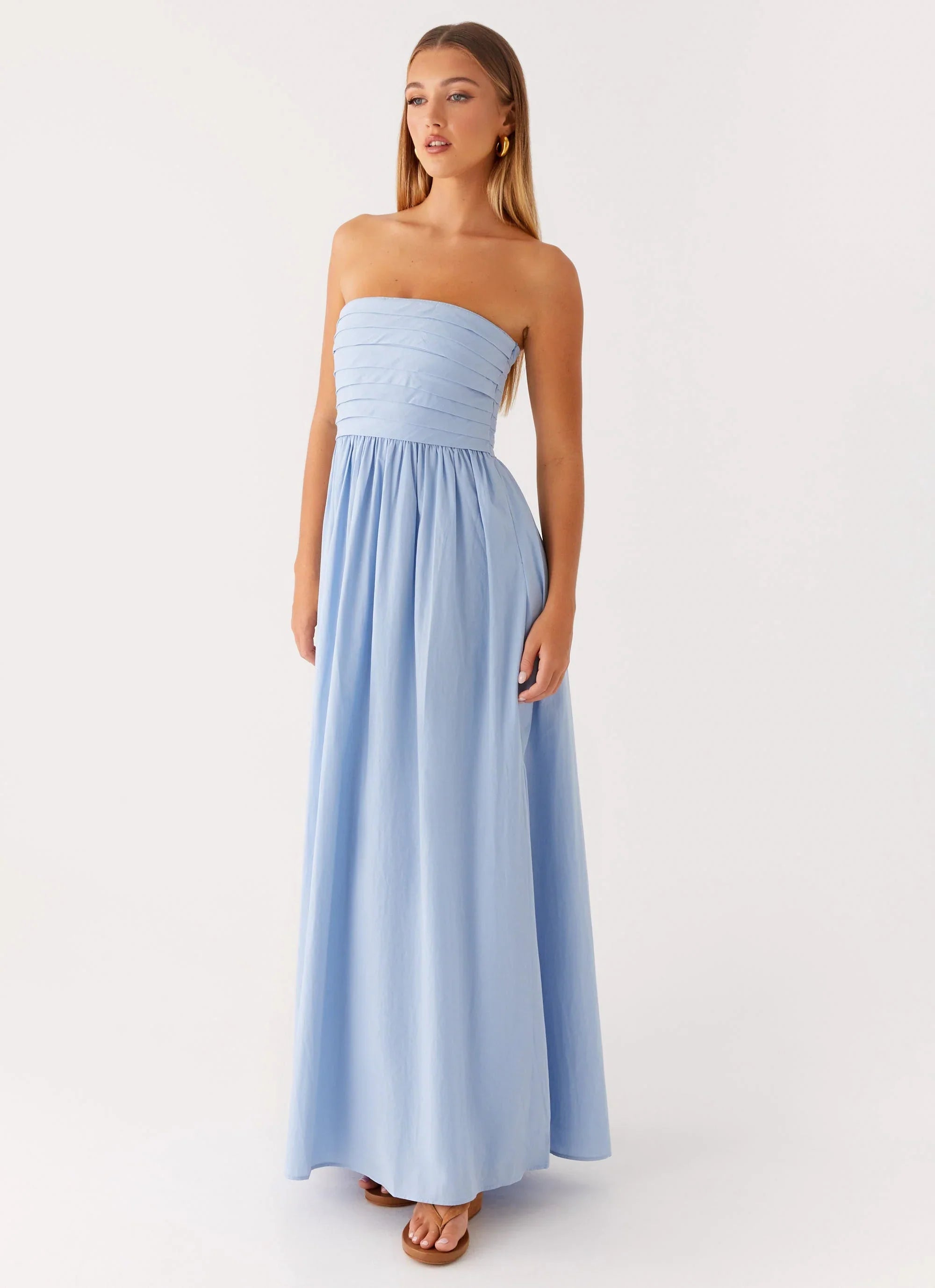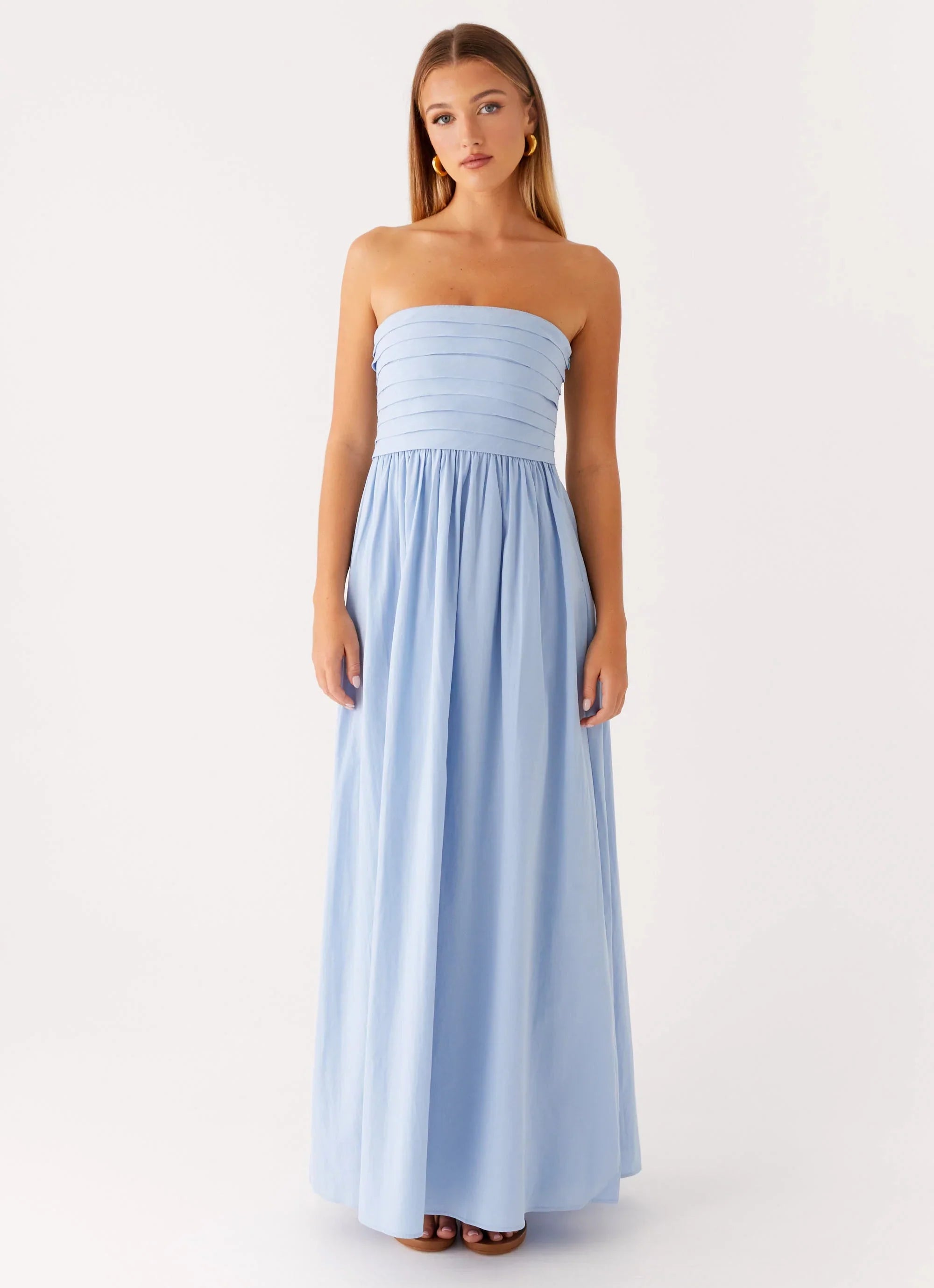 Classic elegance with a modern twist, the Tamia Maxi Dress features a strapless neckline, pleated bodice, and full A-line skirt. Fully lined with an invisible side zip and gripper tape inside the neckline for a secure fit.