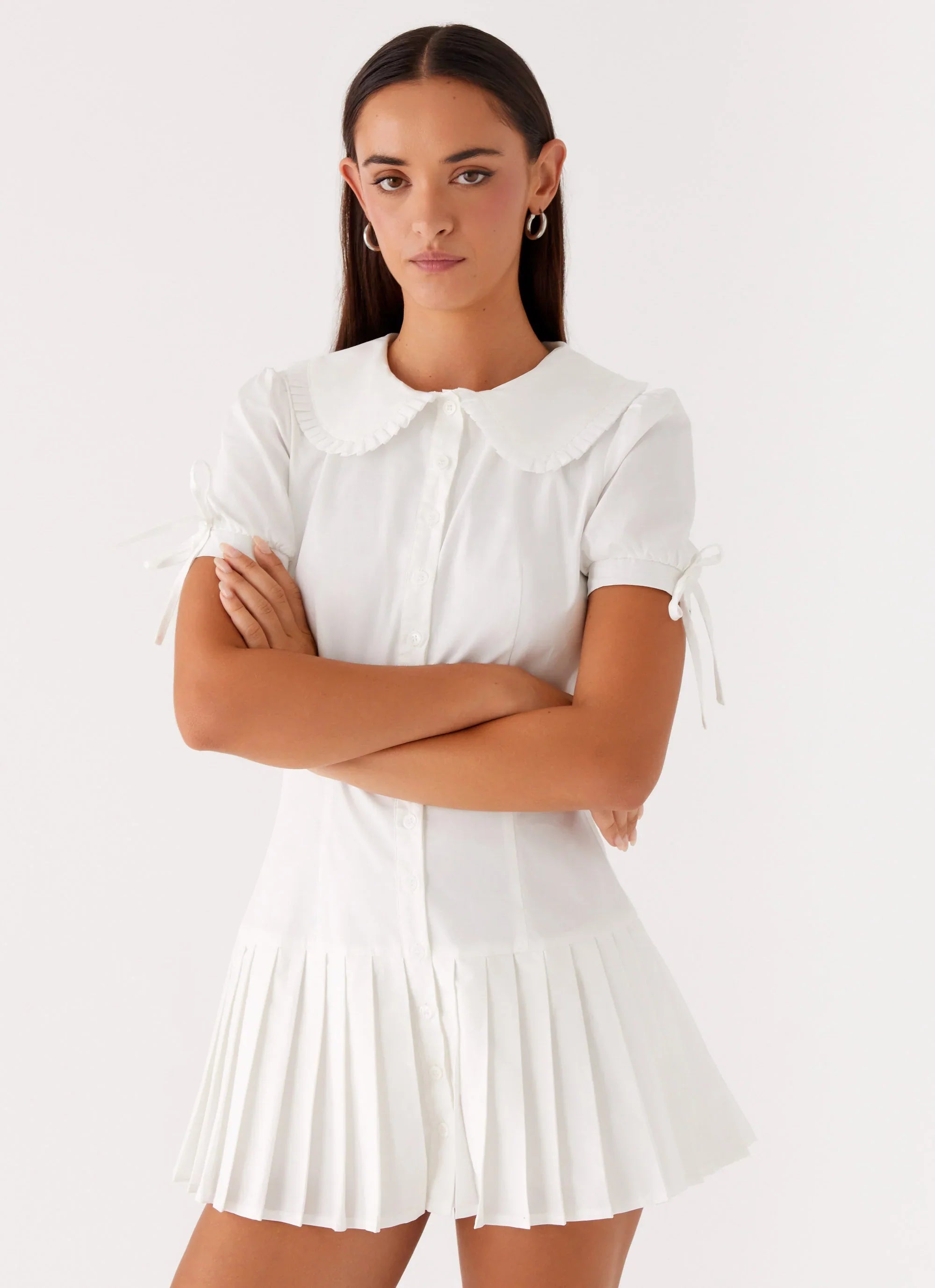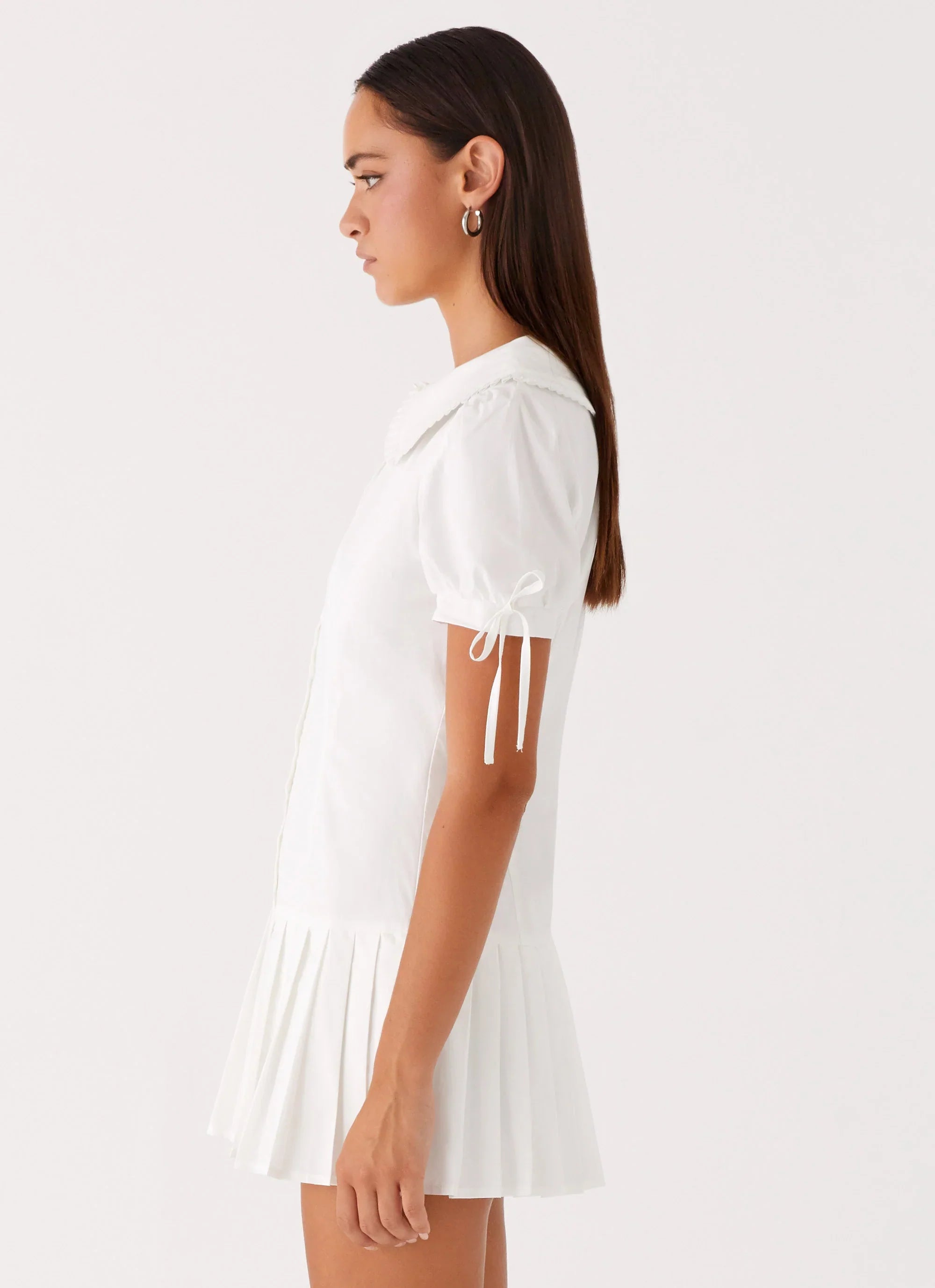 The To Us Pleated Mini Dress is your perfect companion for golden nights. With a classic crew neckline, front buttons, and a flattering drop waist, this dress exudes effortless elegance. Let the pleats sway as you make your entrance into the night.