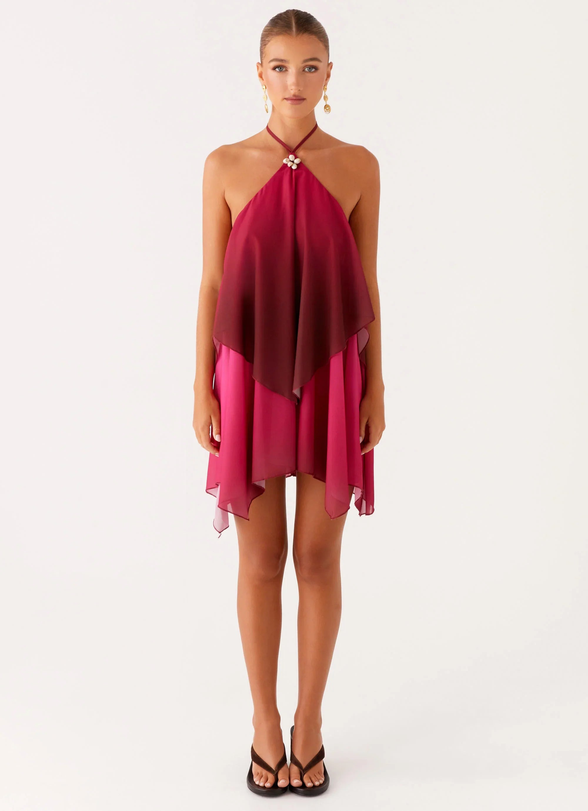 Twin Flame Mini Dress featuring an open back, halter neckline, and exclusive Aceprom print. This bold, eye-catching dress is made to turn heads with its sultry silhouette and unique pattern, perfect for those unforgettable nights out.
