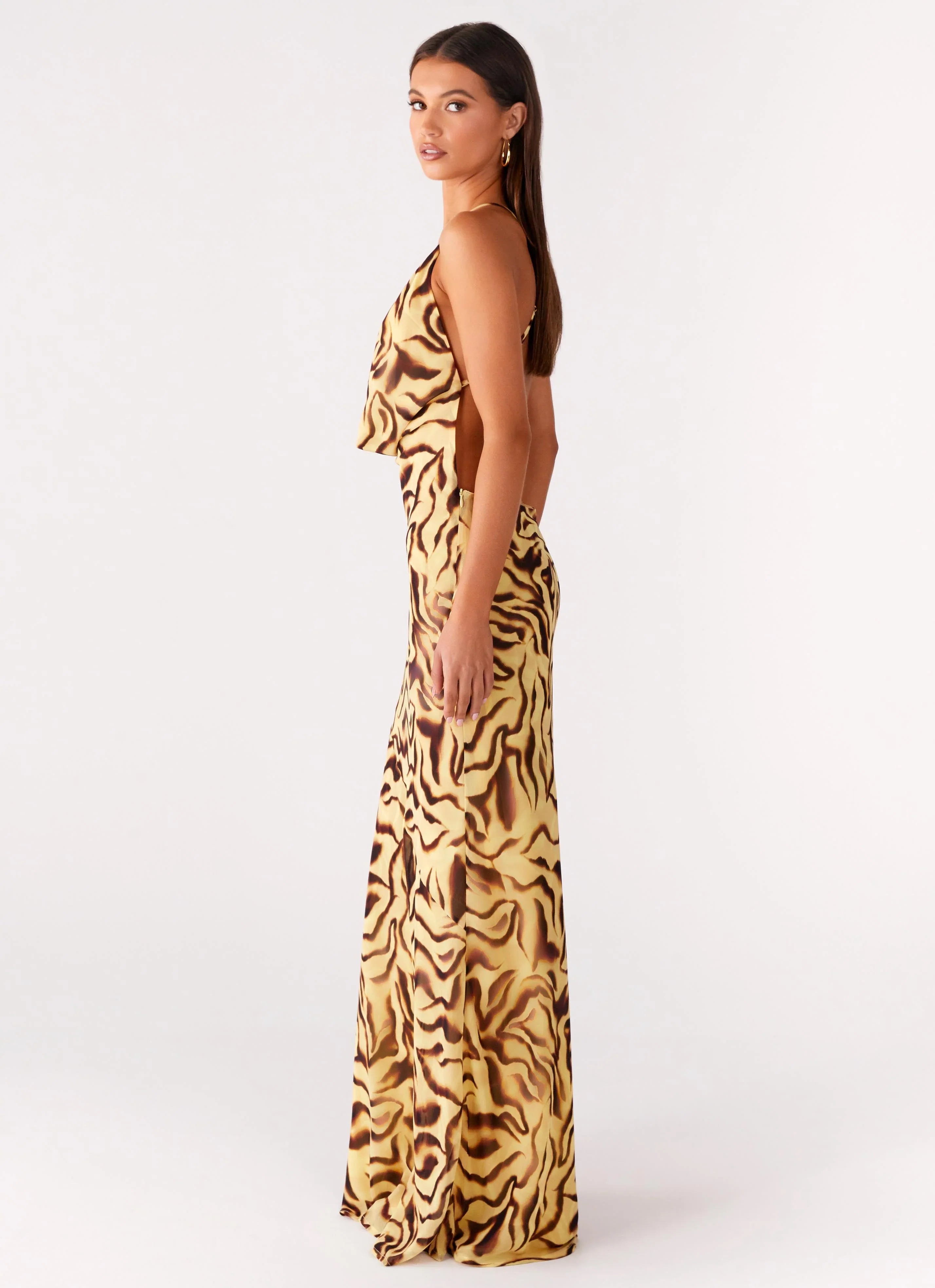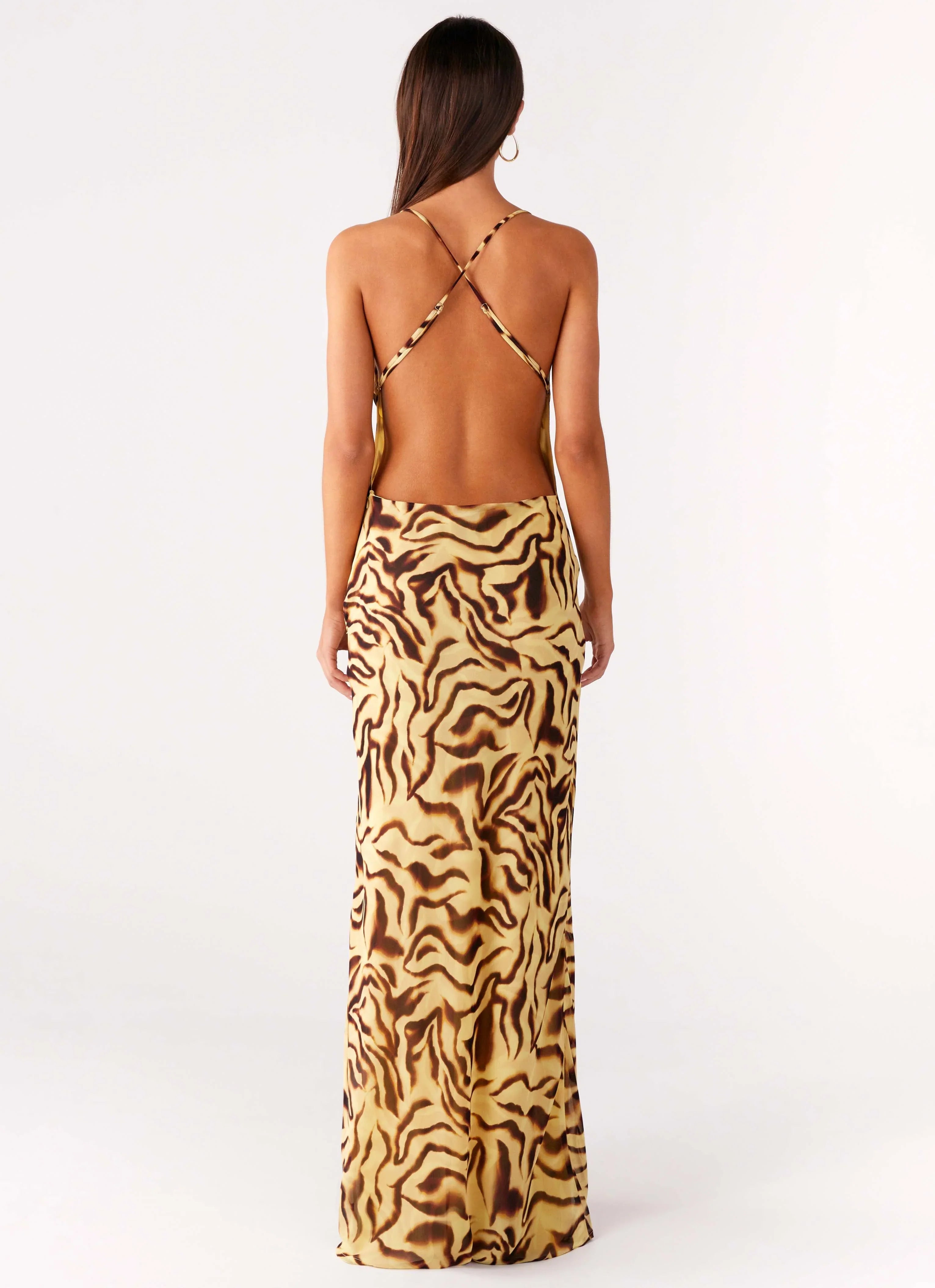 The Viva Lune Maxi Dress is made for golden nights and effortless elegance. Featuring a low cowl neckline and thin adjustable criss-cross straps, this fully lined dress is finished with a low back and side hook and eye with invisible zipper. Crafted in an exclusive print with placement that varies per garment.