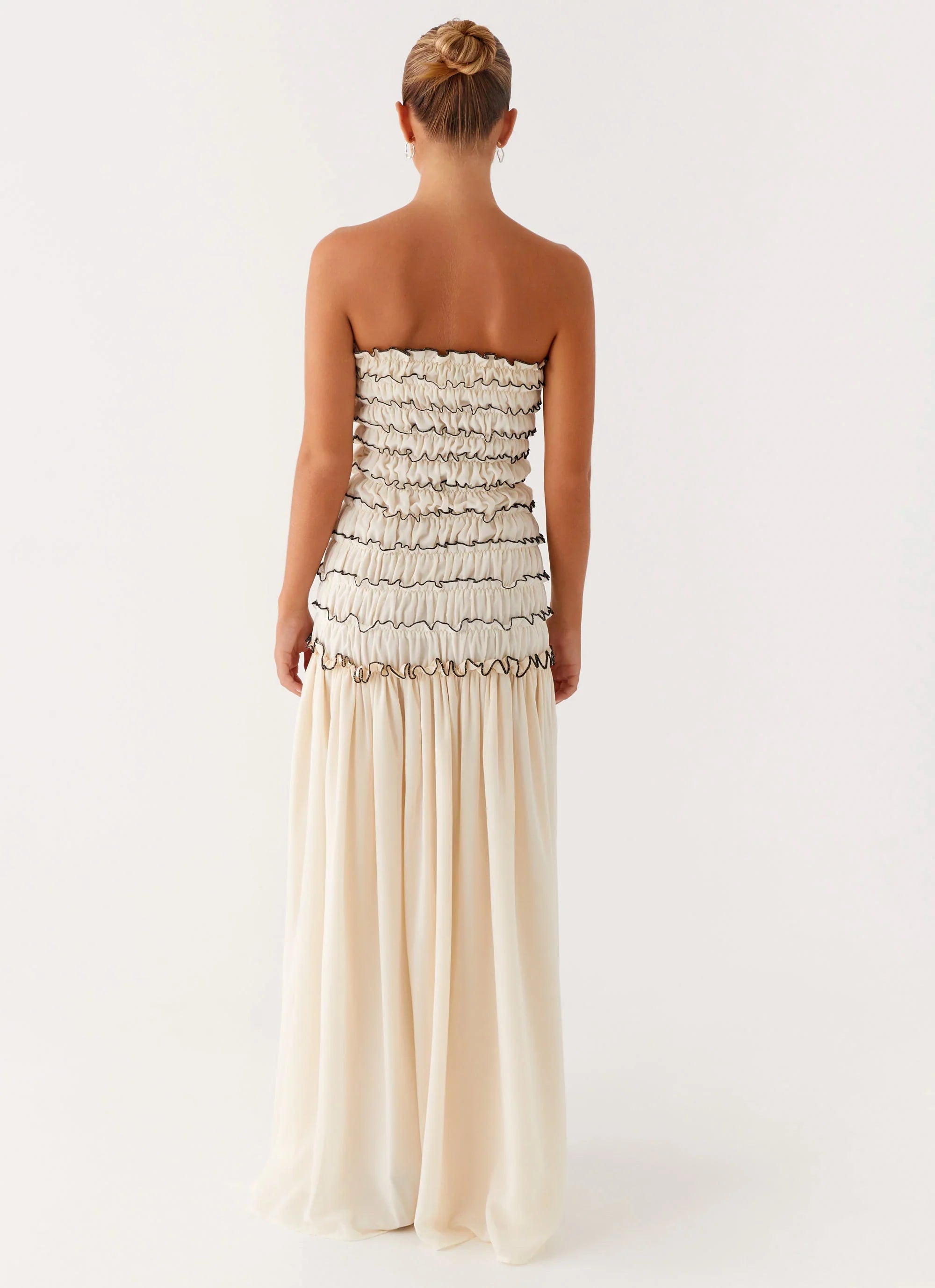 The Zariah Maxi Dress combines elegance and charm with its straight neckline and delicate ribbon bow detailing. This floor-length beauty offers a timeless silhouette, perfect for any formal occasion or evening event. The ribbon bow adds a playful touch, making it a standout piece that balances sophistication with a hint of fun.