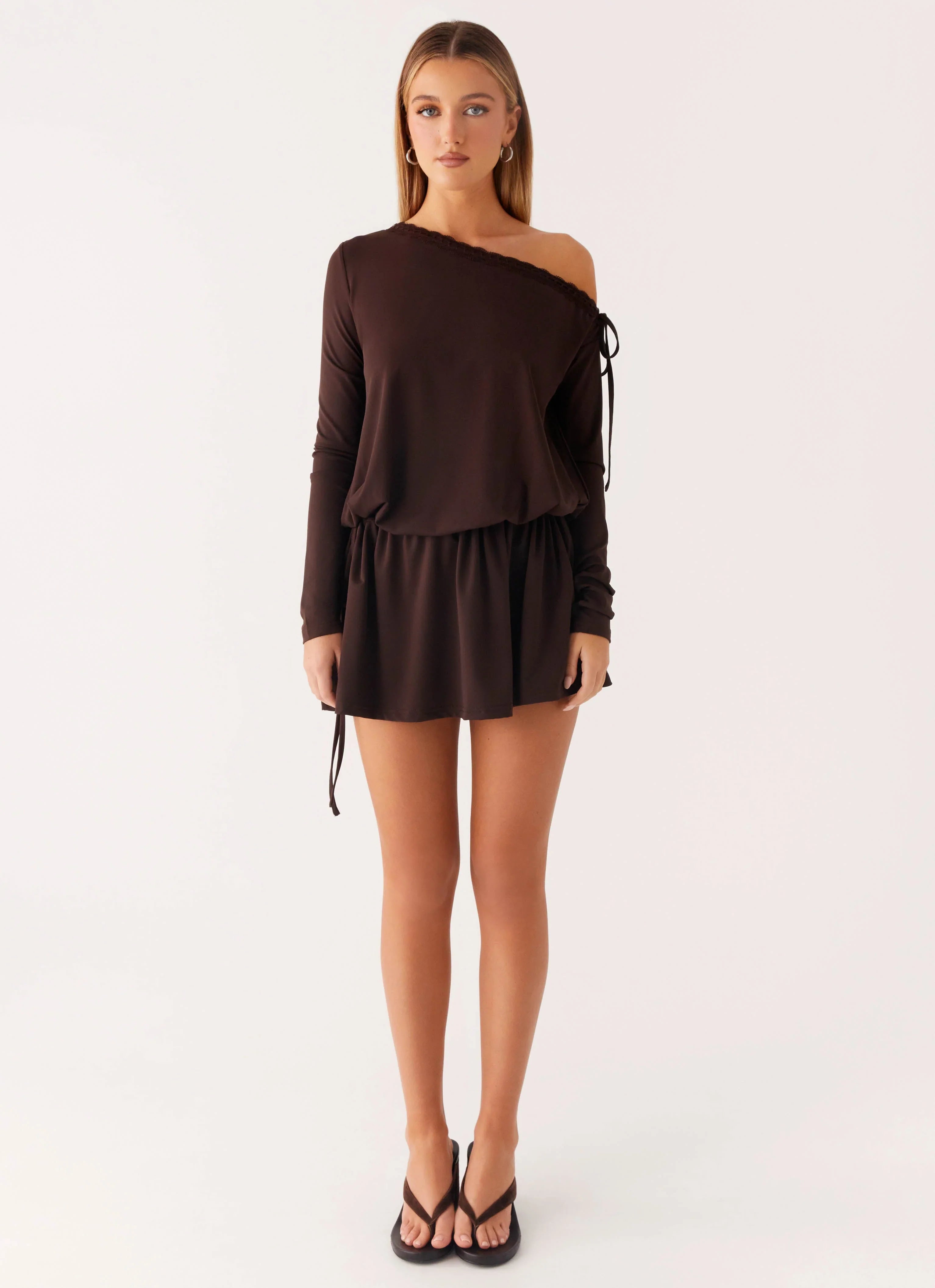 The Zinnia Mini Dress makes a bold statement with its one-shoulder neckline and long sleeves. Crafted from stretch material and fully lined for comfort, it features lace trim, adjustable hip tie, and tie detail for a flattering fit that moves with you from sunset to night.